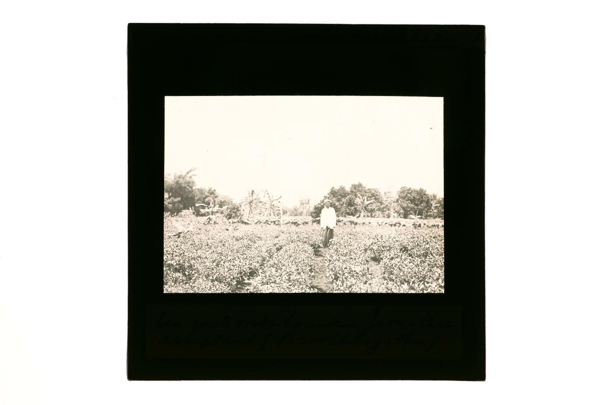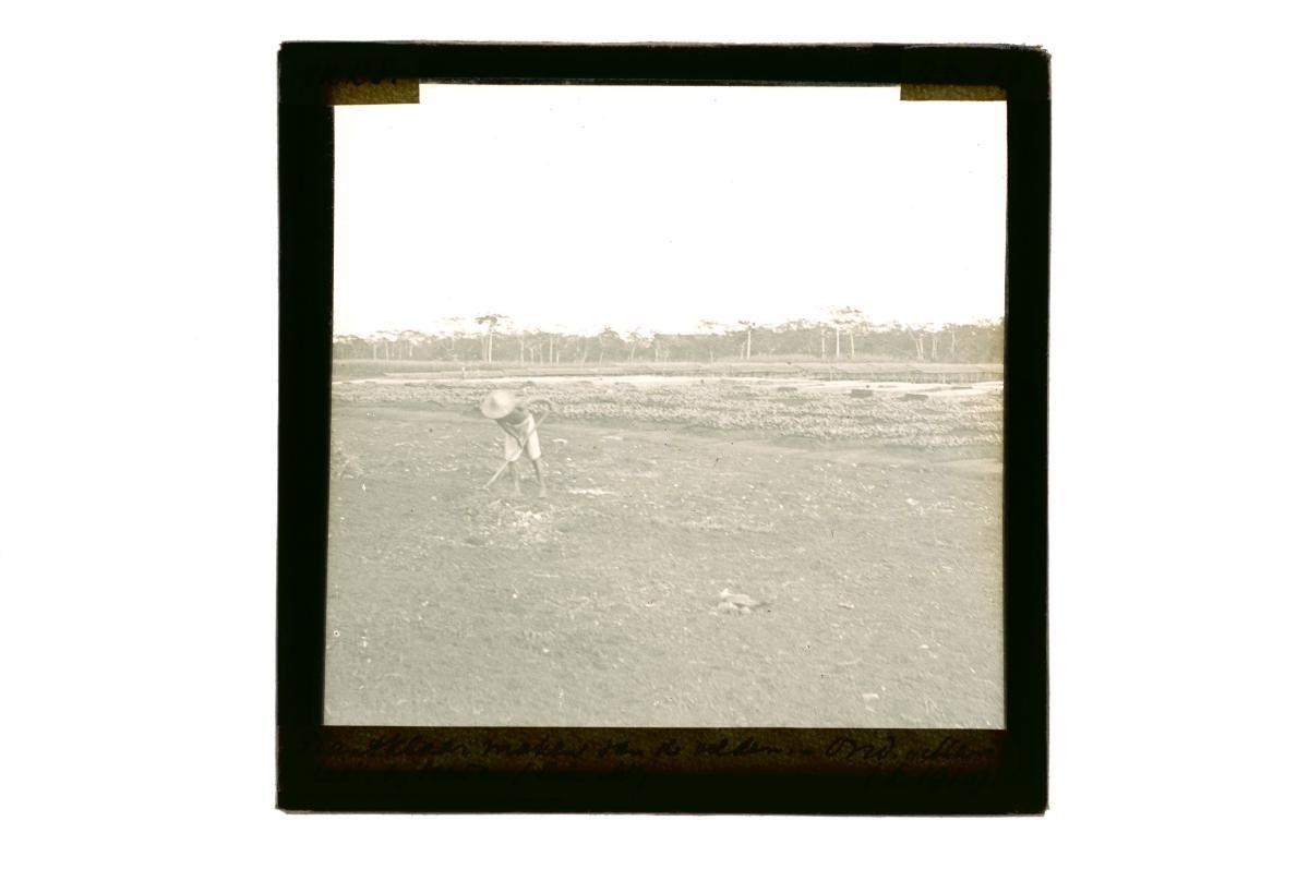 A glass lantern slide depicting a man ploughing a field with oxen