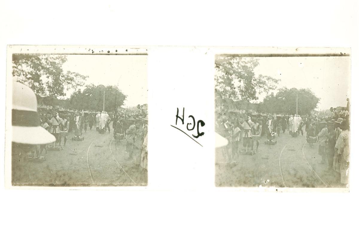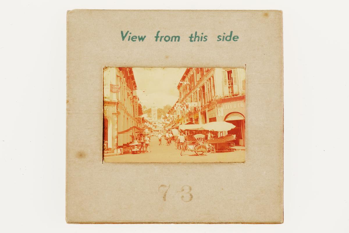 This is a photo of a busy street scene in Singapore and was probably taken by an officer stationed at the military garrison at Fort Canning.Originally called ‘Bukit Larangan’ (meaning ‘forbidden hill’) by the Malays due to the belief that it was once a royal burial site for the kings of old, Fort Canning Hill was first used by the British as the site for the Government House in 1822. It was thus referred to as Government Hill until 1861 when a fort was completed on the hill and named after Viscount Charles John Canning, the Governor-General and First Viceroy of India. The European artillerymen, originally stationed at Pearl’s Hill, then moved to the military quarters at Fort Canning. Various buildings were constructed on the hill for the garrison stationed there, including a hospital. The fort was eventually demolished in 1907, with only the archway entrance still standing today. The hill was also where the first Botanic Gardens was established between 1822 to 1829 under Dr Nathaniel Wallich, although no trace of it remains today.