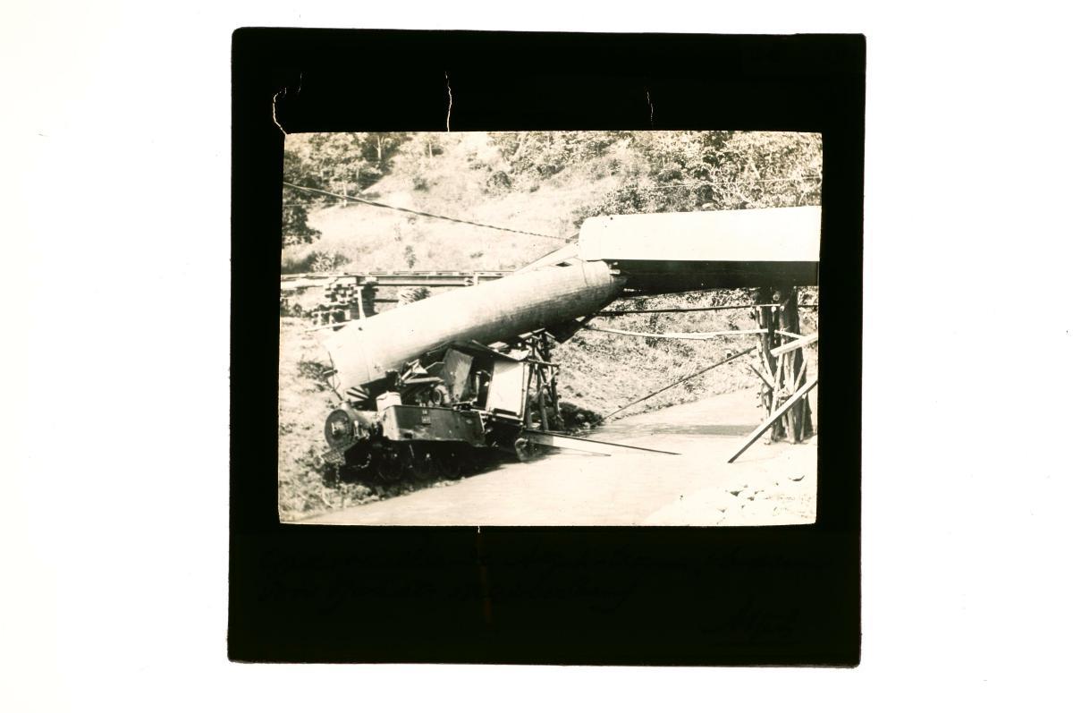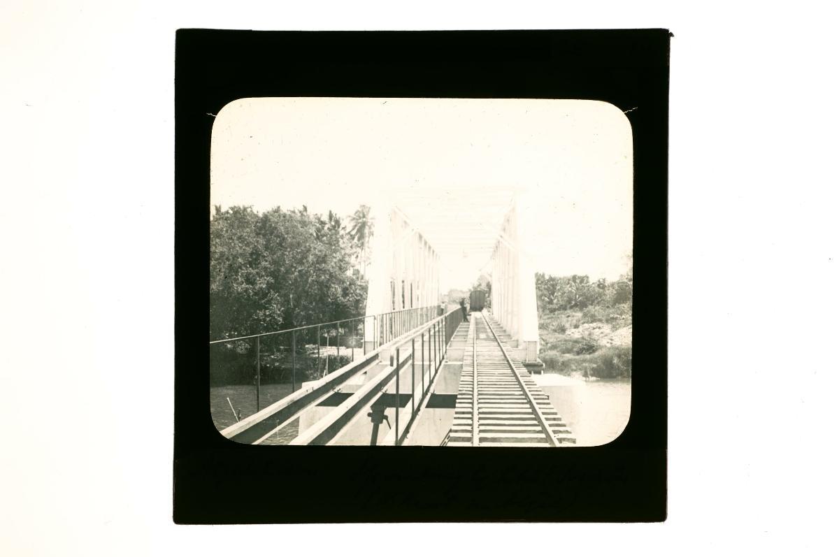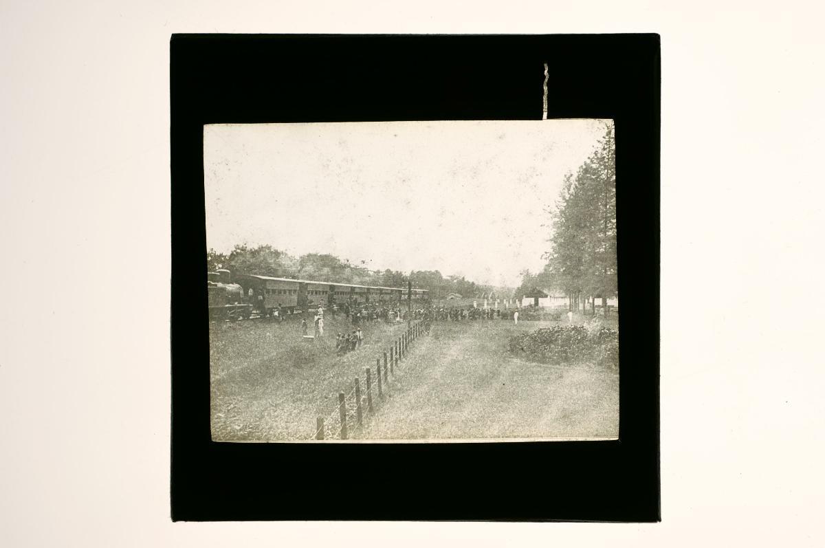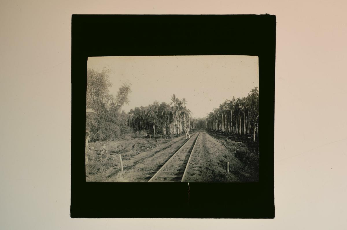 A glass lantern slide depicting a group of men involved in the construction of a railway track