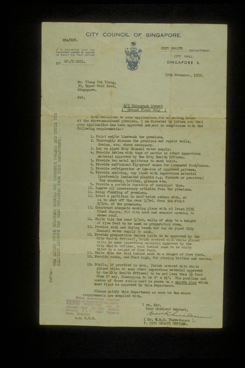This is a City Council of Singapore acknowledgement card sent to the Superintendent of the Markets and Hawkers Department.This artefact is part of a series of documents that belonged to Chew Hee Chuan, a Chinese immigrant who arrived in Singapore in 1935 at the age of 22 to work as a coolie.