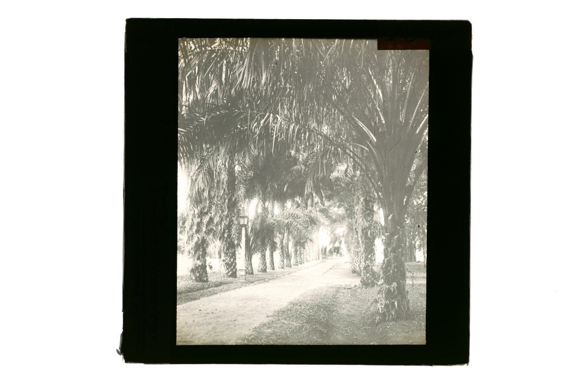 A glass lantern slide depicting a girl posing under an oil palm