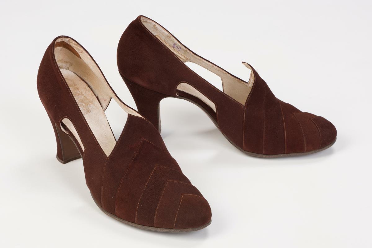 This ladies’ high-heeled aubergine embroidered shoe was made in Shanghai, China.The artefact was donated by Mr. Lim Tiong Guan, whose maternal grandparents moved from Qingmen, Taiwan to Singapore in the first half of the 20th century. His grandfather came to Singapore as a teenager and later owned a remittance business in Xiamen, China and a sugar-trading business in Singapore. As the family were quite affluent, they were able to own various imported goods.
