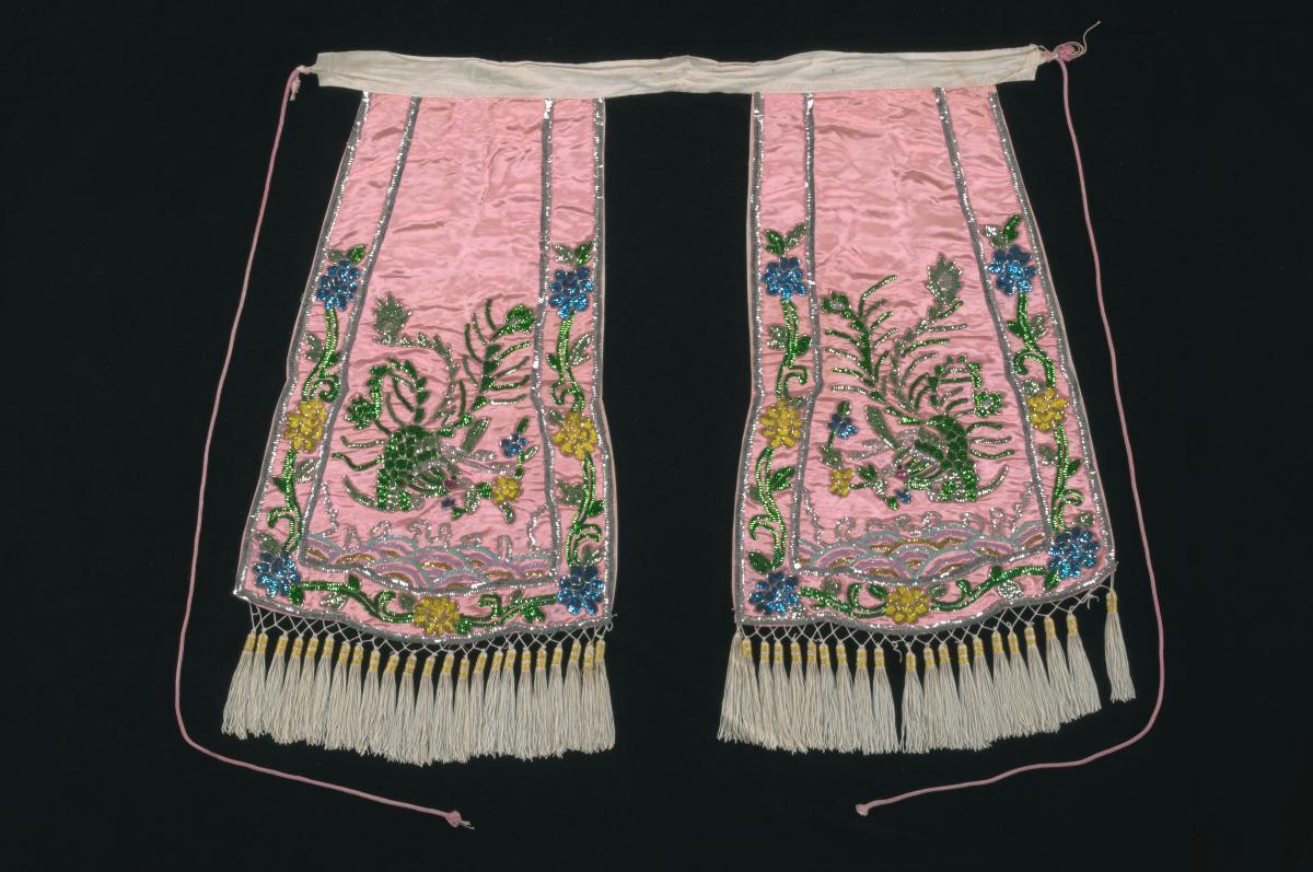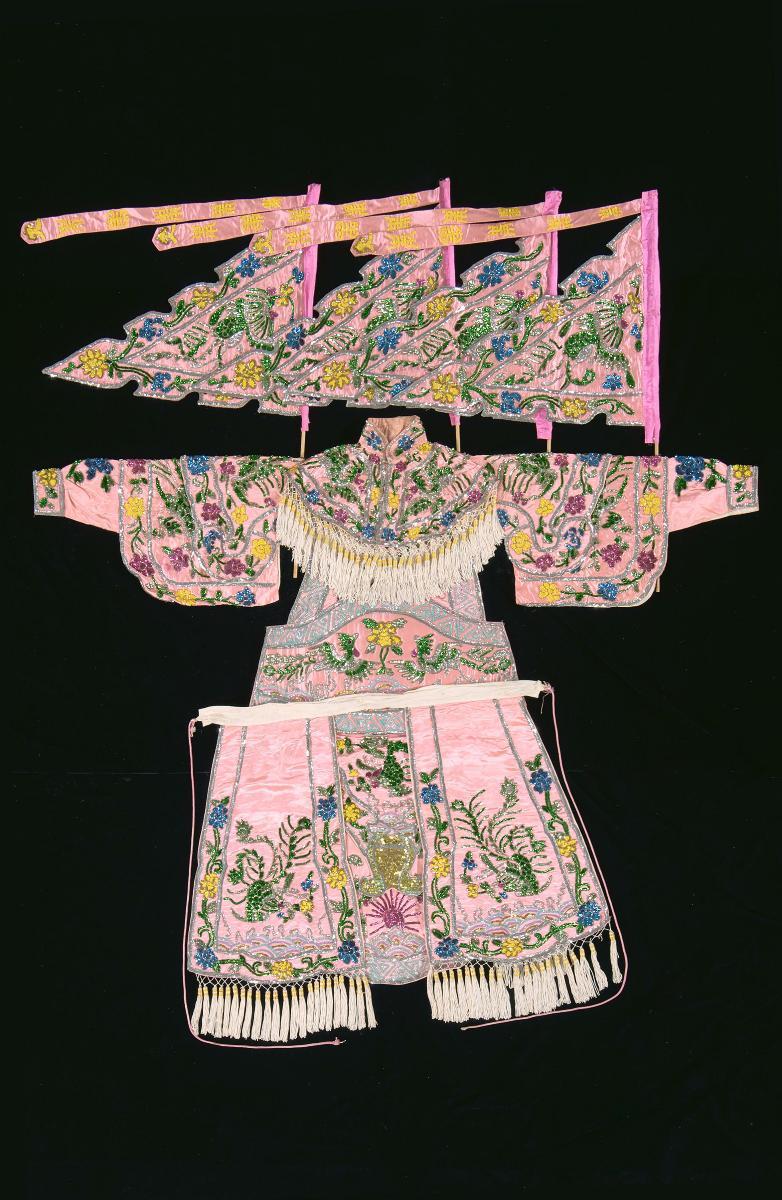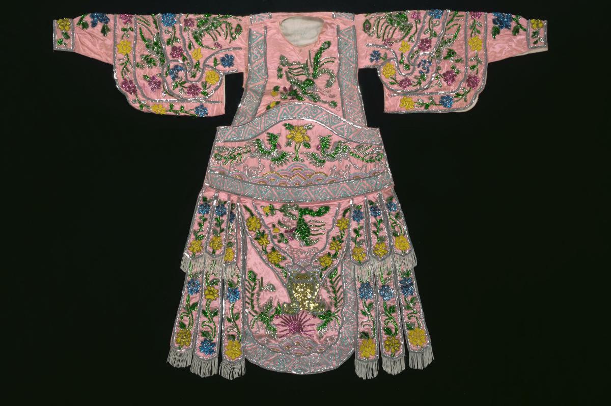 A pink shoulder piece with floral sequins and tassels worn by a ‘dao ma dan’ in a Chinese opera