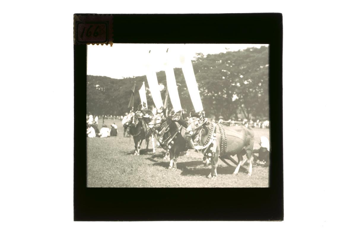 Prior to George Eastman’s invention of rolled photographic films in 1883, glass plates coated with light-sensitive materials were used as negatives. Two main types of glass plate negatives were invented in the latter half of the 19th century – the wet collodion negative in 1851 and the gelatin dry plate negative in 1879. After exposure, an image captured on a glass plate negative would be developed using chemicals, and subsequently printed onto an albumen-coated paper or a glass plate. Images printed on the latter were known as glass lantern slides as they could be projected onto a wall or screen using an image projector, commonly called a “magic lantern”. Picture slideshows featuring glass lantern slides became a popular medium for entertainment and education from the mid-19th century to the early 20th century. The black-and-white slides would often be colour-tinted by hand to enhance their visual effects on the screen.