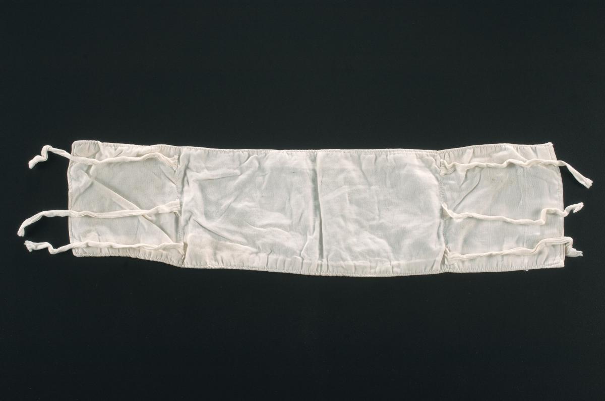 This piece of white cloth with straps was used as a baby wrap, which was a sling carrier used by adults to carry babies around their bodies.This artefact belonged to donor Ms. Angeline Lee Seow Luan’s mother, Mdm. Lim Hwee Luan, a skilful embroider and sewer who worked at the Capitol Embroidery and Dress-making School in the 1950s. With her skills, she embroidered various designs on clothes for her children. She also made her own wedding dress and cheongsam for her wedding. Most women in the 1950s and 1960s were good at sewing and embroidery work.