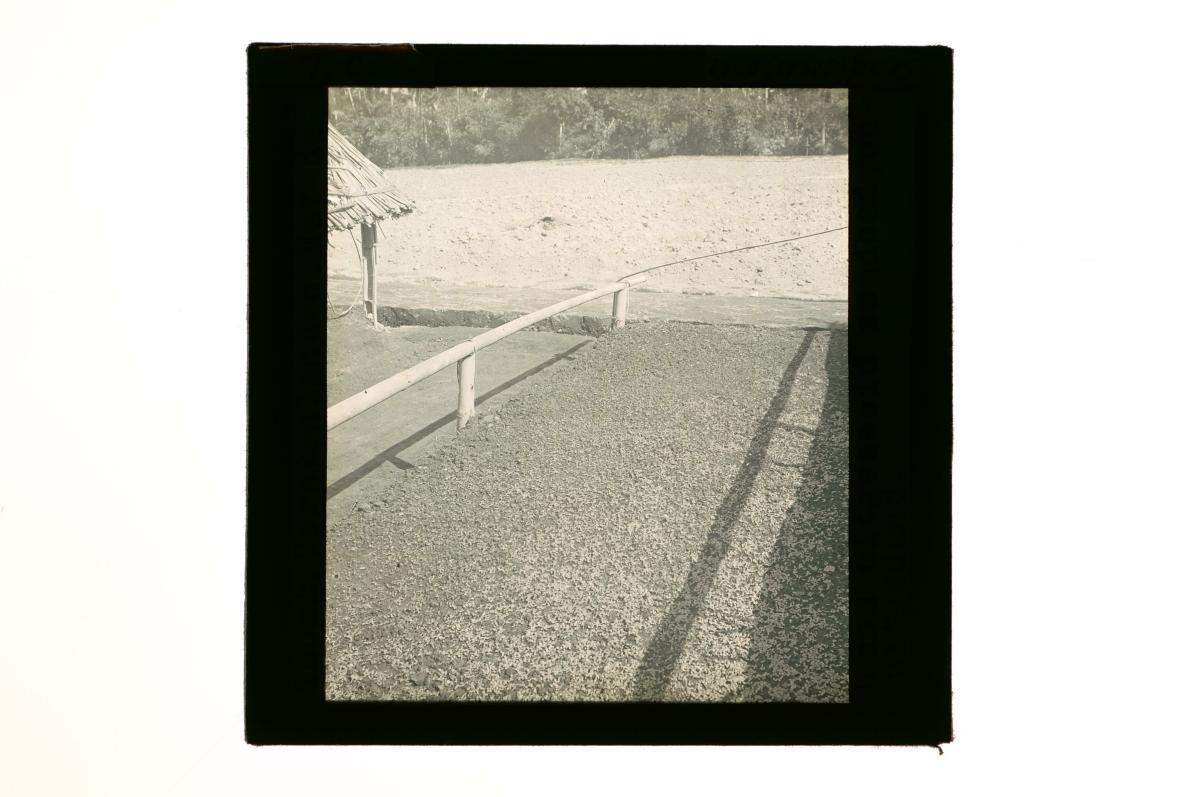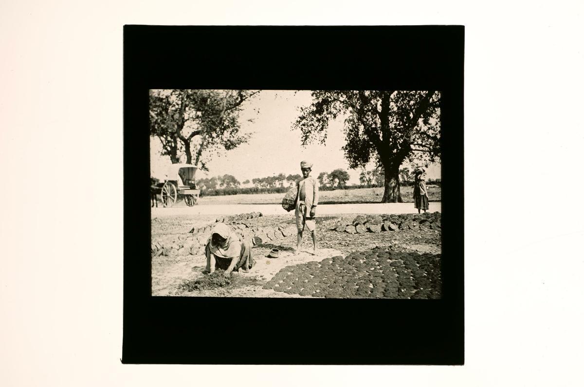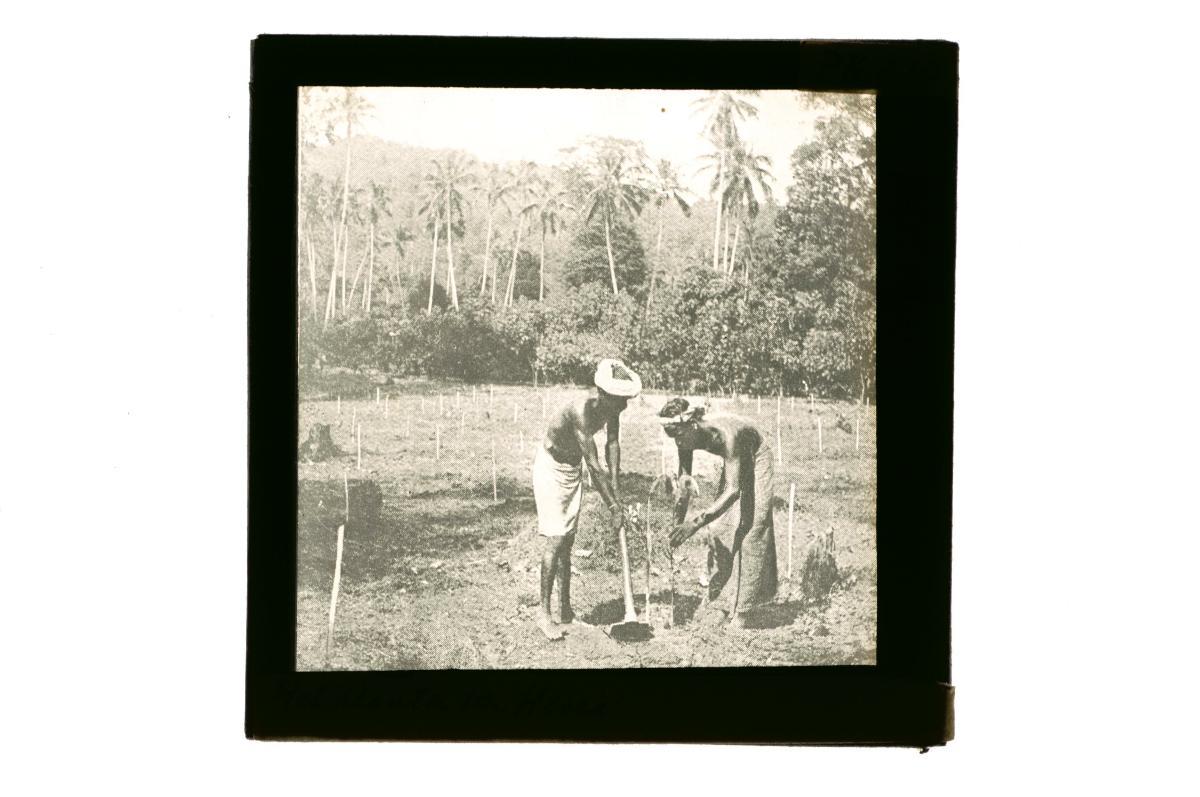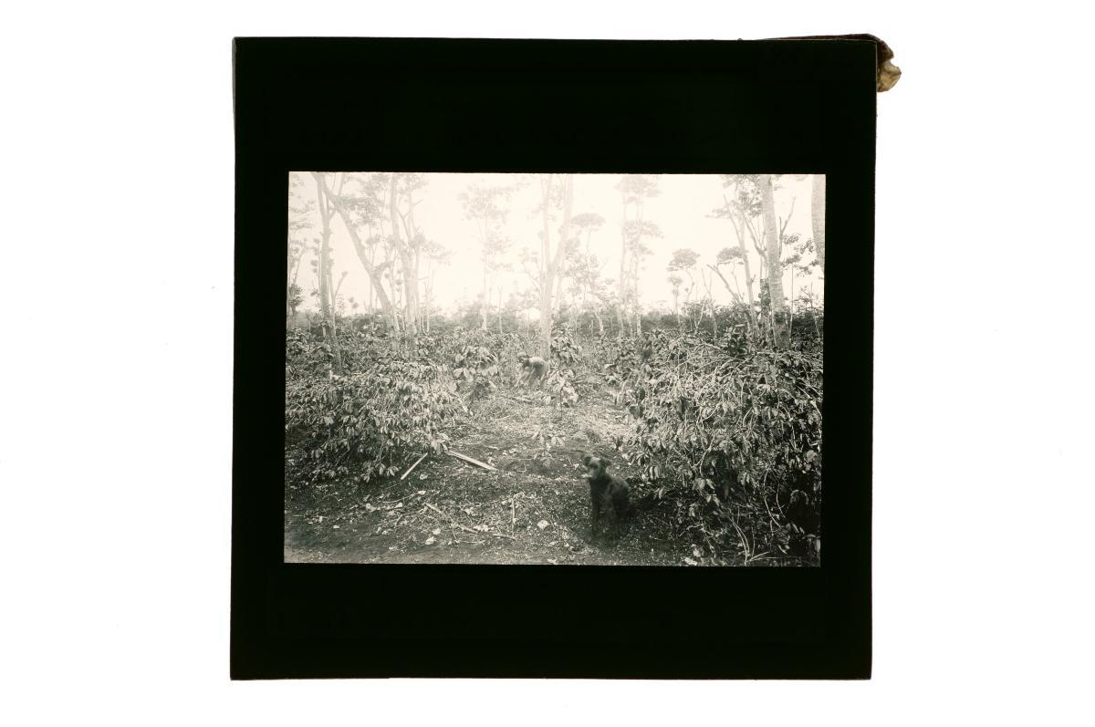 A glass lantern slide depicting a man inspecting an agricultural plot