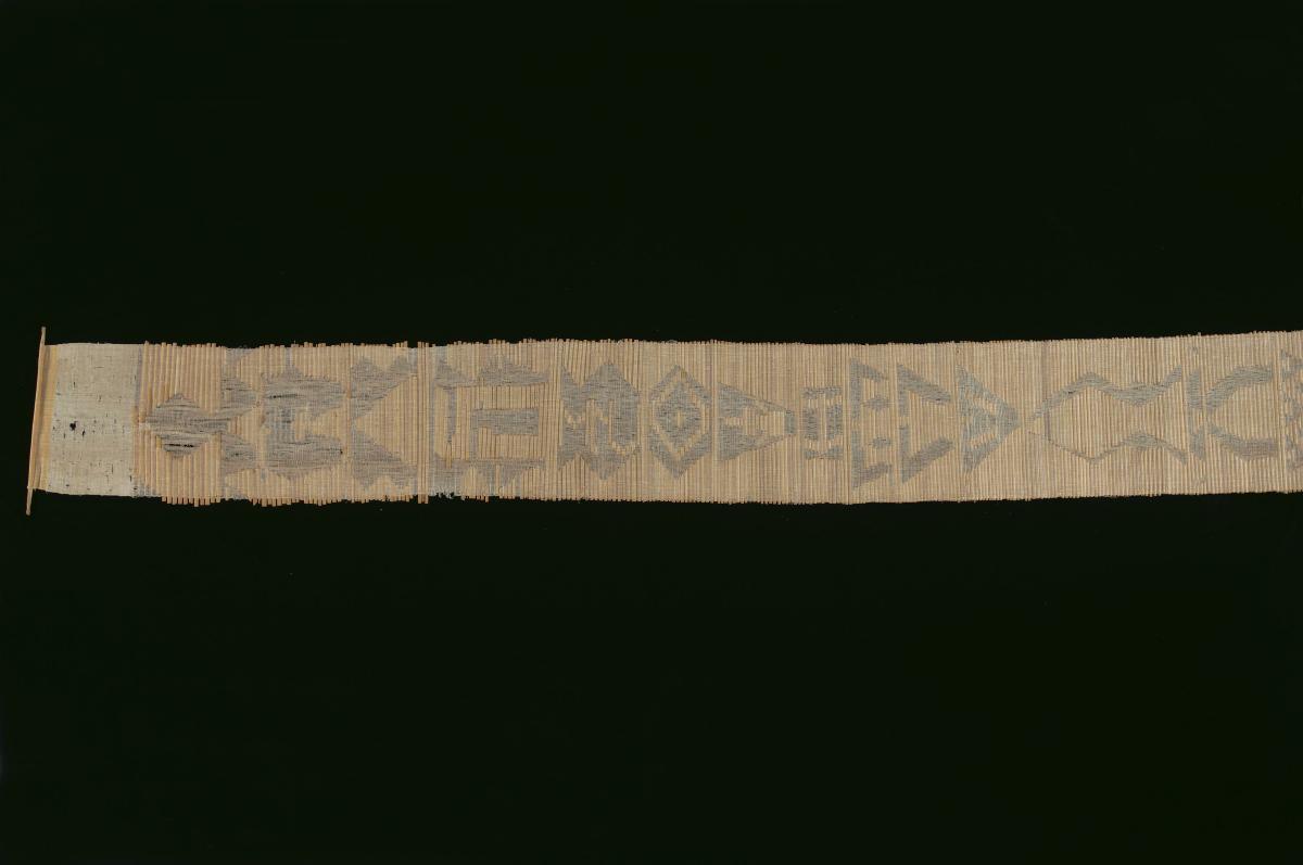 This Tai Lue banner is woven with supplementary-weft (horizontal) bands of motifs in red and indigo blue. Motifs on this piece include elepants, horses, birds, geometric and floral designs, and architectural motifs.The Tai migrated sometime during the 13th century into Southeast Asia through Vietnam to Laos and Thailand, from the Yangtze River region and the southern provinces of China. They also travelled north and west into Myanmar.