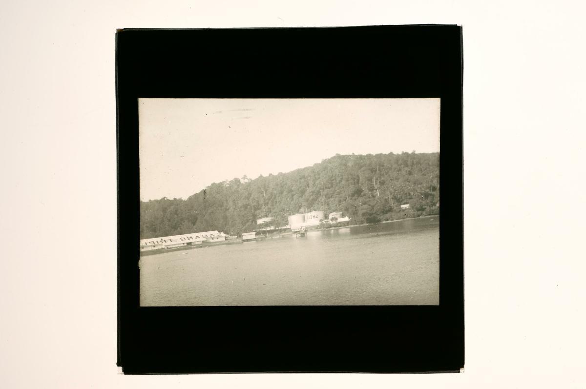 A glass lantern slide depicting a refinery