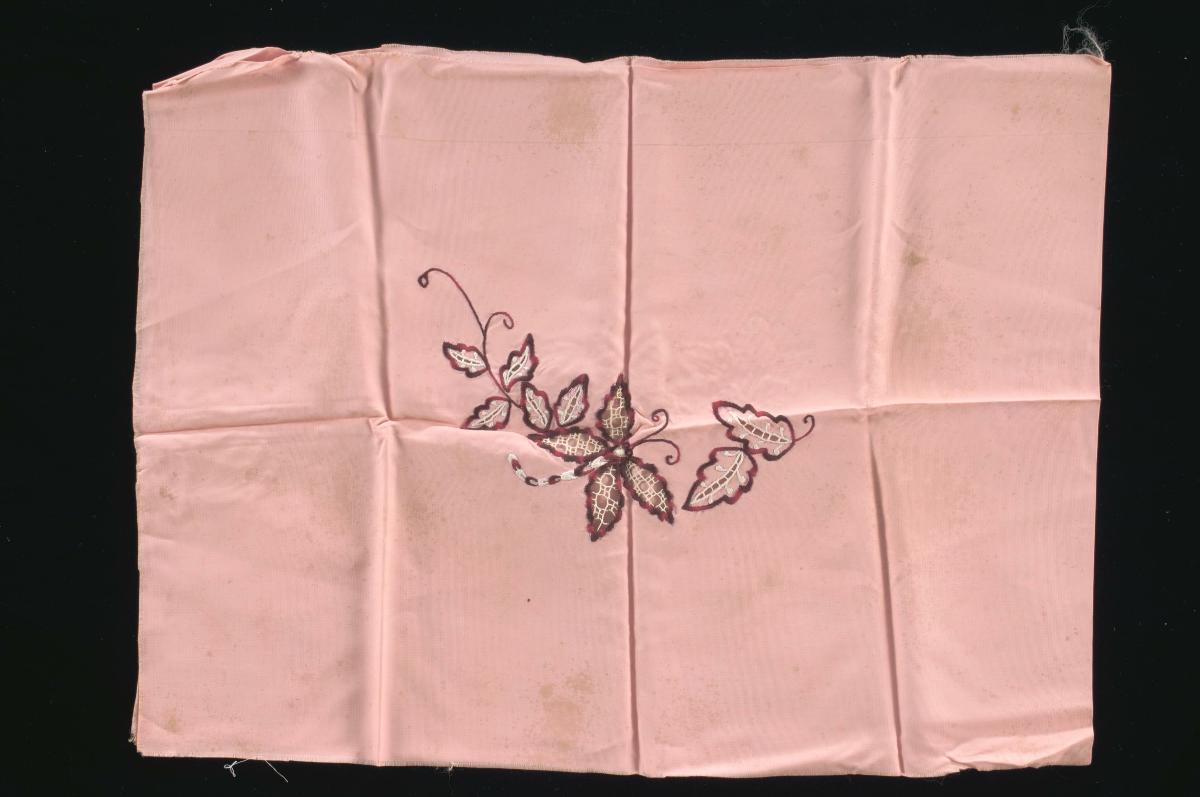 This is a piece of pink cloth with an embroidered dog motif from the Capitol Embroidery and Dressmaking School.This artefact belonged to donor Ms. Angeline Lee Seow Luan’s mother, Mdm. Lim Hwee Luan, a skilful embroider and sewer who worked at the Capitol Embroidery and Dress-making School in the 1950s. With her skills, she embroidered various designs on clothes for her children. She also made her own wedding dress and cheongsam for her wedding. Most women in the 1950s and 1960s were good at sewing and embroidery work.