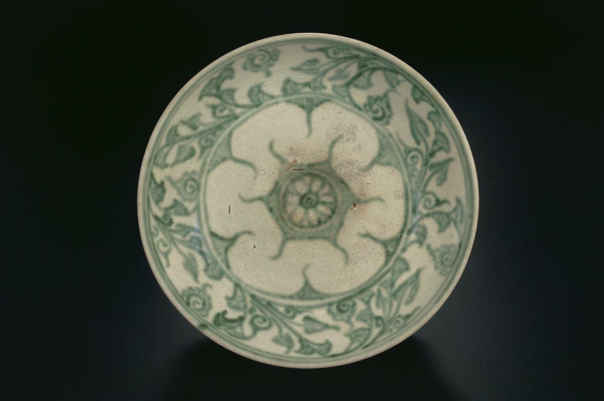 This dish is covered in white tin glaze with copper-green painted decoration of a central motif surrounded by a scroll band.Wares of this type were mainly found in gravesites, in the Tak-Omkoi border area between north Thailand and Myanmar. Scholars have suggested the tin-glaze technology was inspired by Islamic ceramics of the 9th century via India. Yet others have suggested that 15th century Chinese blue and white wares inspired the painted designs.