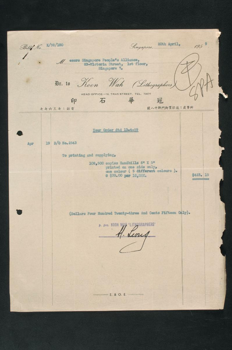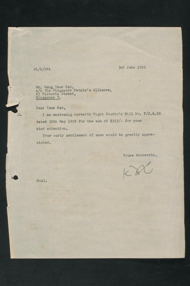 A letter to the Singapore People’s Alliance (SPA) regarding an outstanding bill