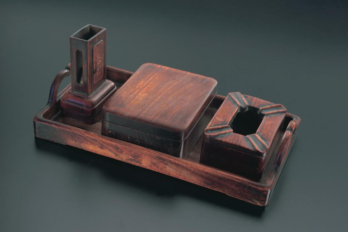 This is part of a smoking set (2008-06099) which consists of a tray, ashtray, box for cigarettes and a container.