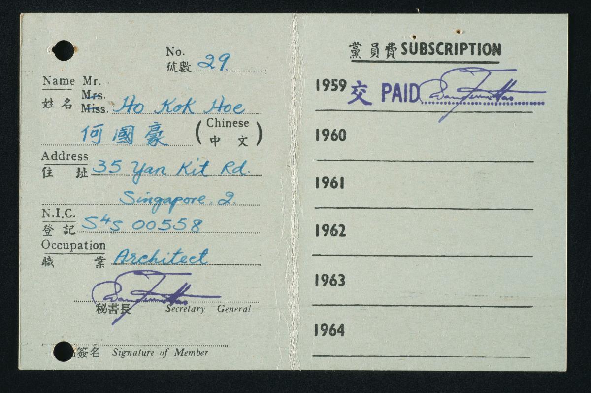 Founded in 1955, the Labour Front (LF) was a political party that was formed from the merger of two parties, the Singapore Labour Party (SLP) and the Singapore Socialist Party (SSP). Amongst its founding members were David Marshall, Lim Yew Hock and Francis Thomas. The LF contested in the 1955 Legislative Assembly Election and secured the most votes. As it did not win by a majority, the LF formed a coalition government with the Singapore Alliance Party and Marshall became Singapore’s first Chief Minister. The LF government, however, lasted for only one term, with Marshall resigning from his post in 1956 following the breakdown in negotiations with the British for Singapore’s self-government. The LF subsequently merged with the Liberal Socialist Party (LSP) to form the Singapore People’s Alliance (SPA) in 1958. The SPA fared badly in the 1959 Legislative Assembly Election, securing only four seats. It did not win any seats in the 1963 General Election and was dissolved in 1965 after Singapore gained independence.