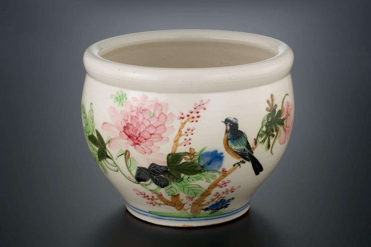 This pearlware (earthenware with a blue-tinted glaze) sugar bowl is painted with a Chinese-inspired landscape of pagodas and trees. It reflects how Chinese motifs generally became stylised through successive Western adaptations. Here the trees and shading of the rocks are depicted with hatched and cross-hatched lines.Chinese blue and white porcelain continued to be in demand in the 18th century and English manufacturers sought to imitate the Chinese imports for a share of the lucrative market. By the early 1760s, improvements had been made to Worcester blue and white porcelain, such that it was able to compete with Chinese imports, especially in terms of price.