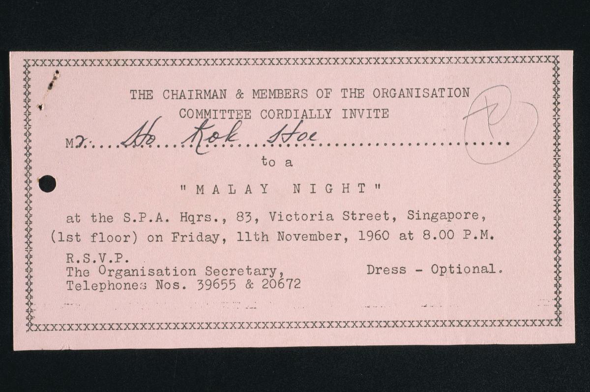 Ho Kok Hoe was the Labour Front (LF) candidate for the River Valley ward in the 1957 City Council Election.The Singapore People’s Alliance (SPA) was a political party that was formed in 1957. Founded and headed by Singapore’s second Chief Minister, Lim Yew Hock, the Alliance was the result of a merger between the Labour Front (LF) and the Liberal Socialist Party (LSP). The SPA took part in the watershed 1959 Legislative Assembly Election, in which all 51 seats in the legislative body were wholly elected. It fared badly at the polls, losing out to the People’s Action’s Party (PAP) who won by a landslide. The SPA did not win any seats in the 1963 General Election and was dissolved in 1965 after Singapore gained independence.