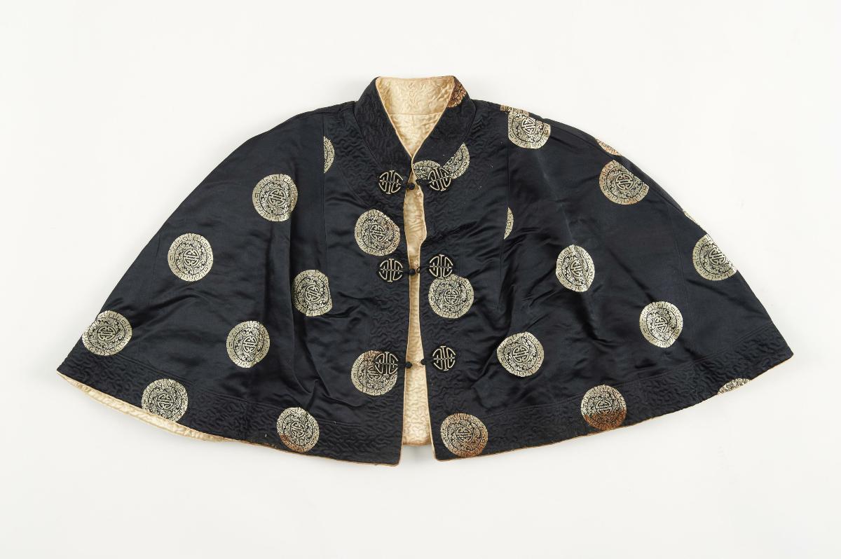 This black velvet cape belonged to Mrs Kwok Swee Ying. This short cape is dated to the second half of the 1940s and was probably purchased in Hong Kong. She was on her way to Australia where her banker husband Mr Alfred Kwok Chan Kwan, was posted to. The cape is made of velvet and is fastened with two buttons at the collar. The lining is made of silk and the label “Mow Kie” is sewn on the inside of the collar. This type of cape is usually worn over an evening dress.