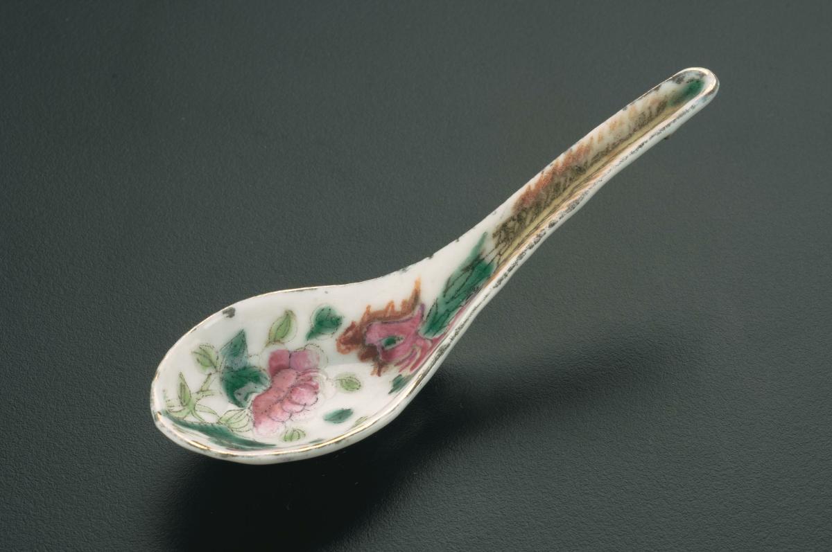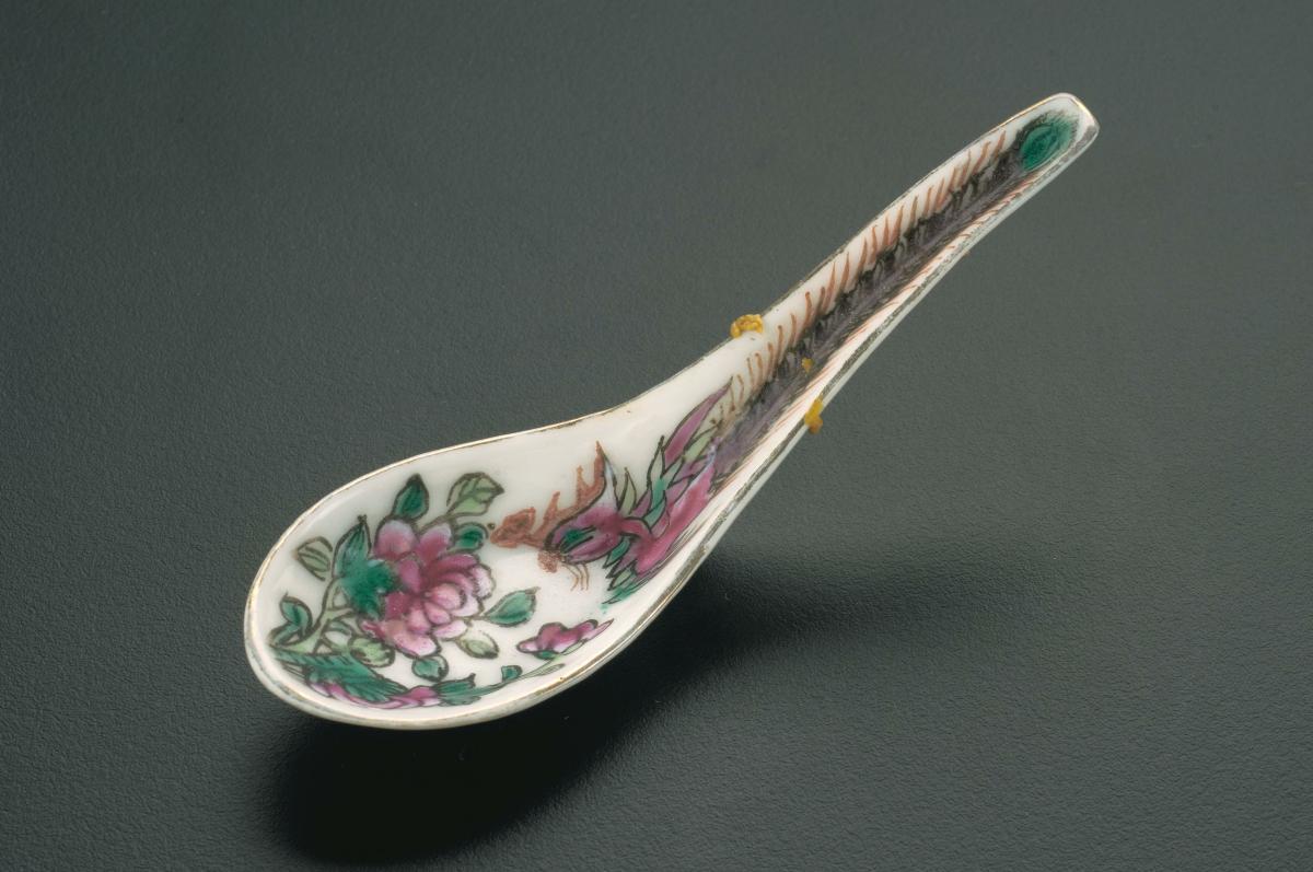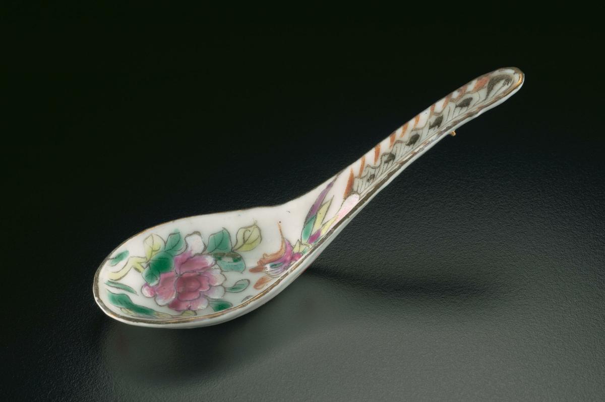 This white-ground dessert spoon belongs to a Nonyaware dinner service. The decoration of colourful enamel pattern with the mythical phoenix trailing up the handle with peony flowers in the well, was a popular design. A Peranakan dinner service, like this set, can total many hundreds of pieces, with about eight different types of vessel shapes and sizes, including dessert ware. Large quantities of this kind of porcelain were made for export to Southeast Asia. Only the wealthiest Peranakan families could afford to place orders for large sets of matching porcelain for celebratory feasts. These impressive displays were laid out on the ‘tok panjang’ (literally ‘long table’) that was the formal dining table for special occasions.