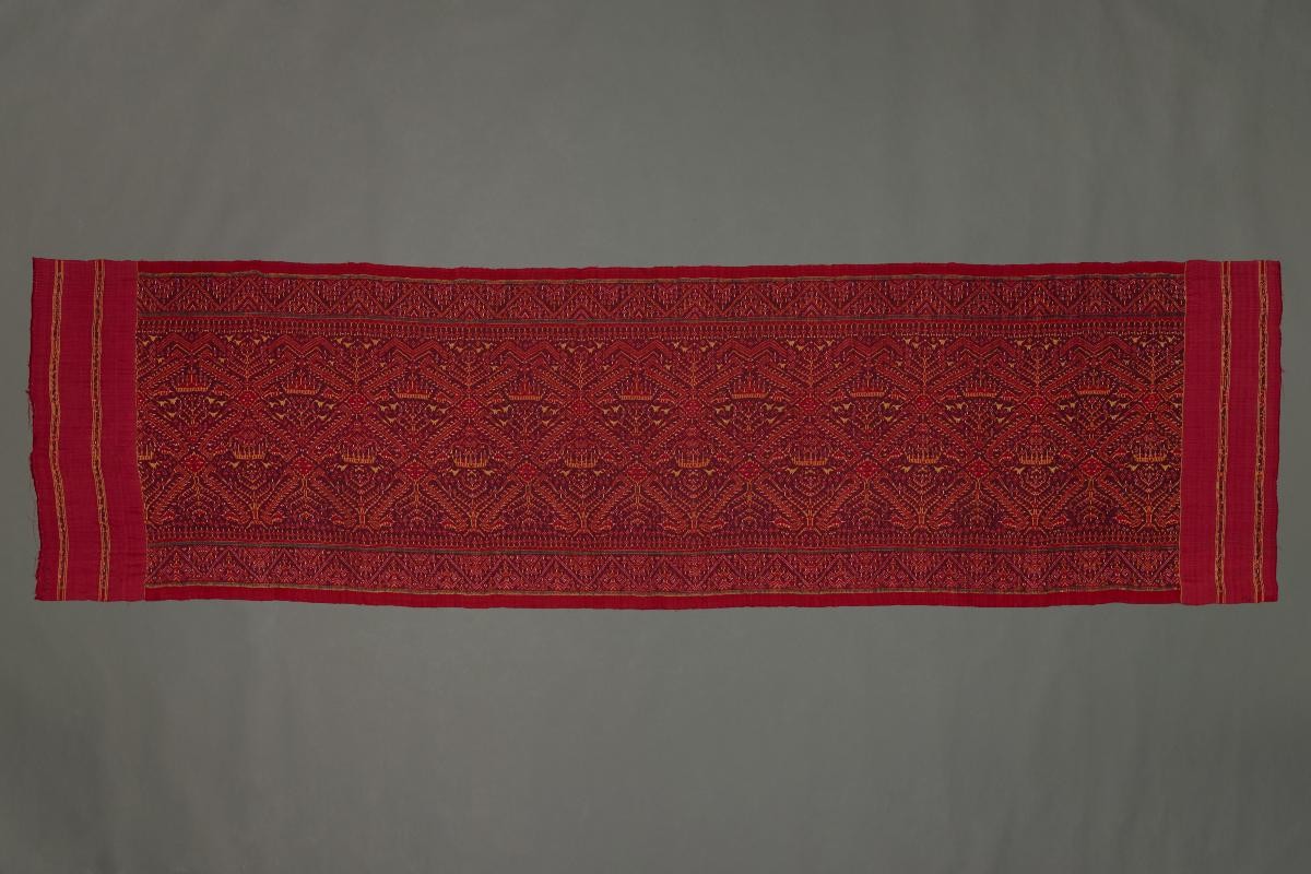 This waistcloth four large bands of indigo per half piece and blue or black edges at the middle seam. The large bands are divided by light blue lines which means that the piece can be worn at festivities. In the case that a sarong does not have these light blue lines, means that the weaving has been made significantly to be worn by a deceased woman, and it will be buried with her.