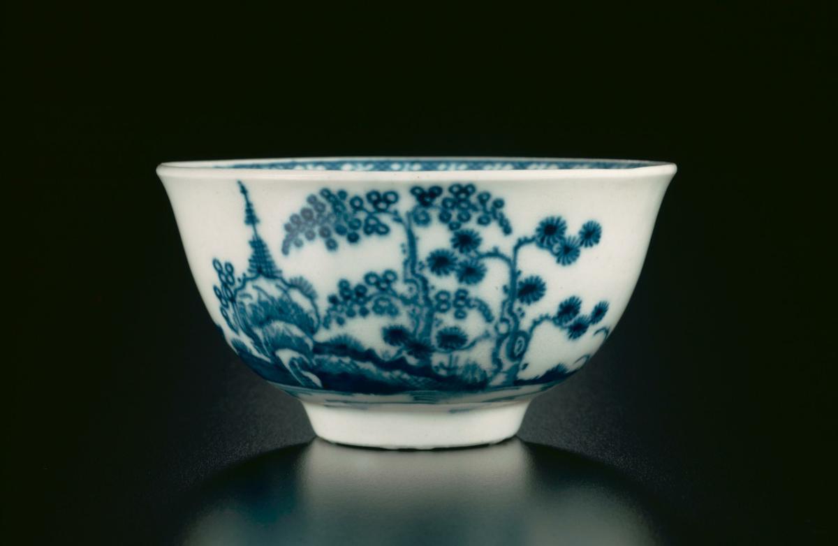 The decoration on this saucer was referred to as the ‘Cannonball’ pattern as the river landscape has round rocks or ‘cannonballs’ in its design. Probably derived from a Chinese pattern, this highly popular design was also used by other English porcelain factories. Chinese blue and white porcelain continued to be in demand in the 18th century and English manufacturers sought to imitate the Chinese imports for a share of the lucrative market. By the early 1760s, improvements had been made to Worcester blue and white porcelain, such that it was able to compete with Chinese imports, especially in terms of price.