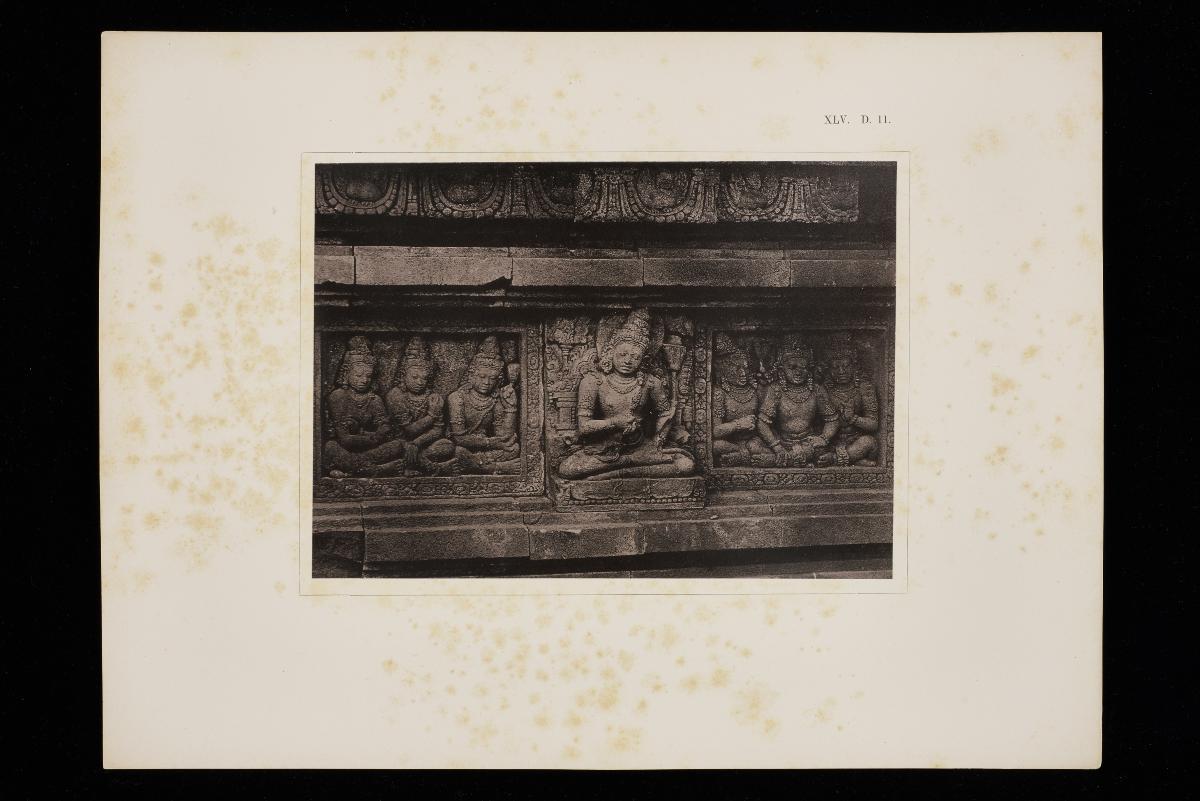 This photograph shows a relief sculpture mounted on the walls of the Hindu- Javanese Candi Prambanan, which houses three main temples dedicated to the worship of the Hindu deities of Shiva, Vishnu and Brahma. The seated figure in the middle resembles a Bodhisattva, which speaks of the influence of Buddhism as an alternative religion that existed and flourished alongside Hinduism in Java at that time. The sculptures share the same characteristics and features as special Hindu divinities. Followers in groups of threes can be seen on either side, but they appear to recede into the background. This photograph is part of a portfolio containing an extensive photographic survey detailing the Candi Prambanan. It was compiled by Dr. Isaac Groneman, a Dutch scholar of Javanese history and culture. He was assisted by pioneer Indonesian photographer Kassian Cephas, who was responsible for the pictorial documentation during the excavation of the site from 1889 to 1890.