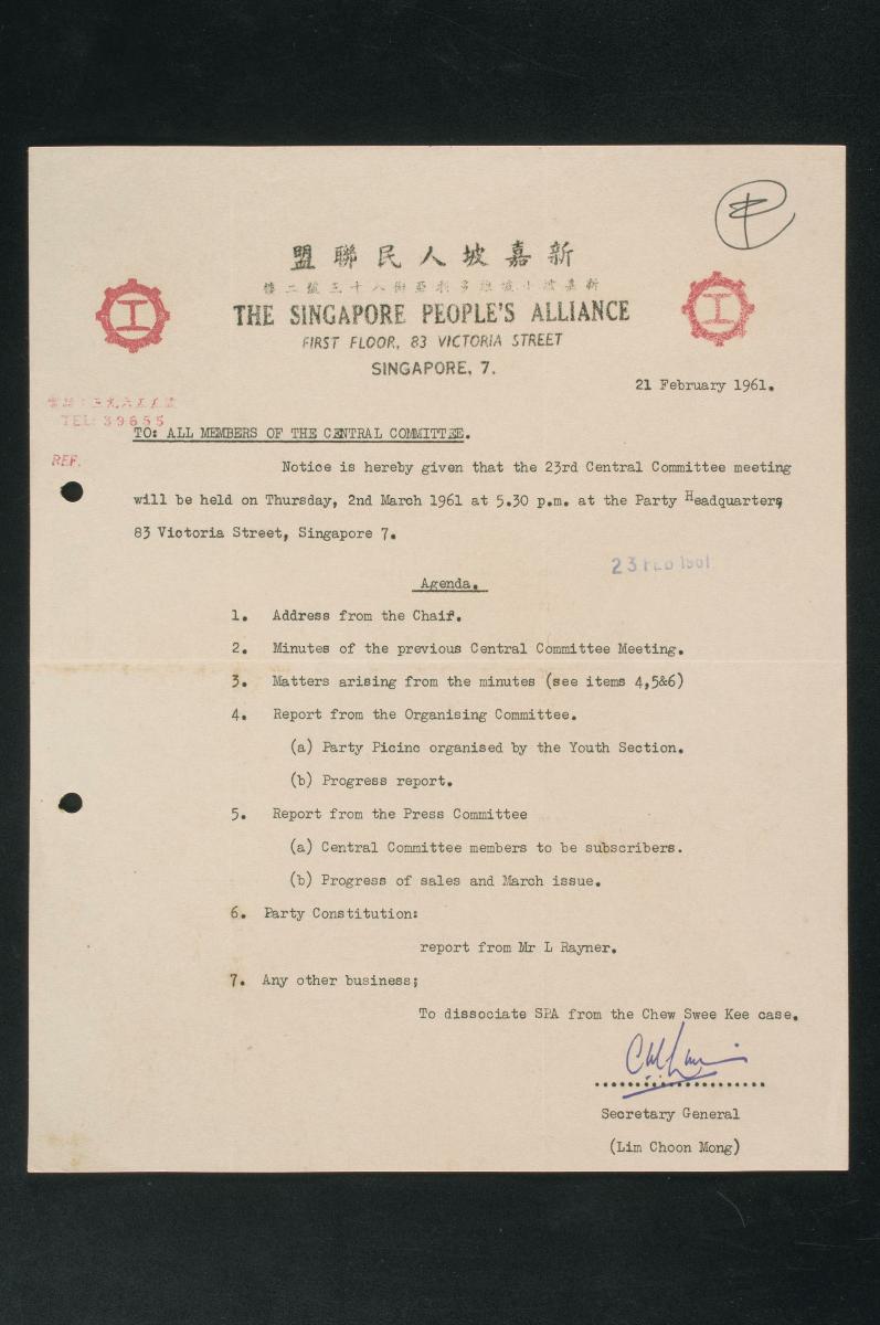 A Singapore People’s Alliance (SPA) circular on the 19th Central Committee Meeting and the agenda