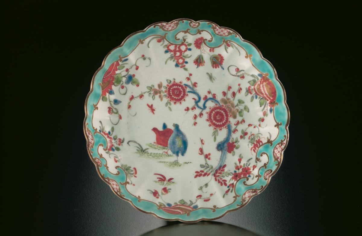 This octagonal dish features the ‘quail’ pattern, a motif depicting one or two small birds with various flora, which was commonly found on Japanese Kakiemon porcelain. It is one of the most popular Japanese patterns adapted for use on European-made porcelain. There were various European versions of this pattern. The most common is the one displayed here. It shows a pair of birds, one in red and the other in blue, under a flowering prunus tree. Several factories tried different ways to enhance this design. At Bow, the pattern was often combined with a red floral border enhanced with touches of gold as shown in this example. The Bow factory, established in 1744, was probably the largest of all porcelain factories in 18th century England, employing about 300 people by the 1760s. Unlike Chelsea which focused on manufacturing porcelain for the affluent, Bow produced wares for a larger market.