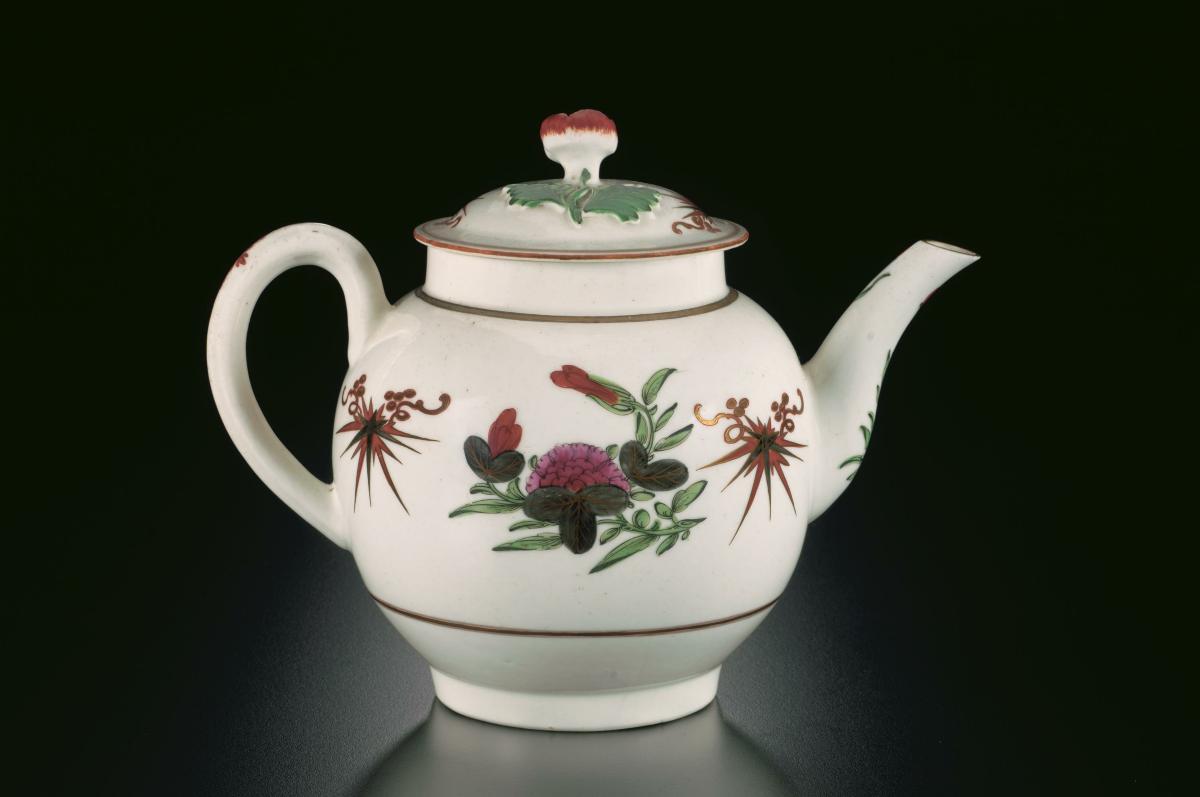 This tea cannister belongs to a larger tea service decorated in a style known as the ‘Queen’s pattern’. The origin for this name is unknown, but the design has panels of Japanese style flowers alternating with narrower blue bands embellished with gold and a red chrysanthemum medallion. Generally, tea canisters could be bought as part of a complete tea service or separately as a pair. A full tea service by the late 1760s would have comprised at least 40 pieces. Apart from multiple tea and coffee cups with matching saucers, other standard items included a teapot, sugar bowl, milk jug as well as a slop bowl (into which the dregs from tea and coffee cups were emptied).