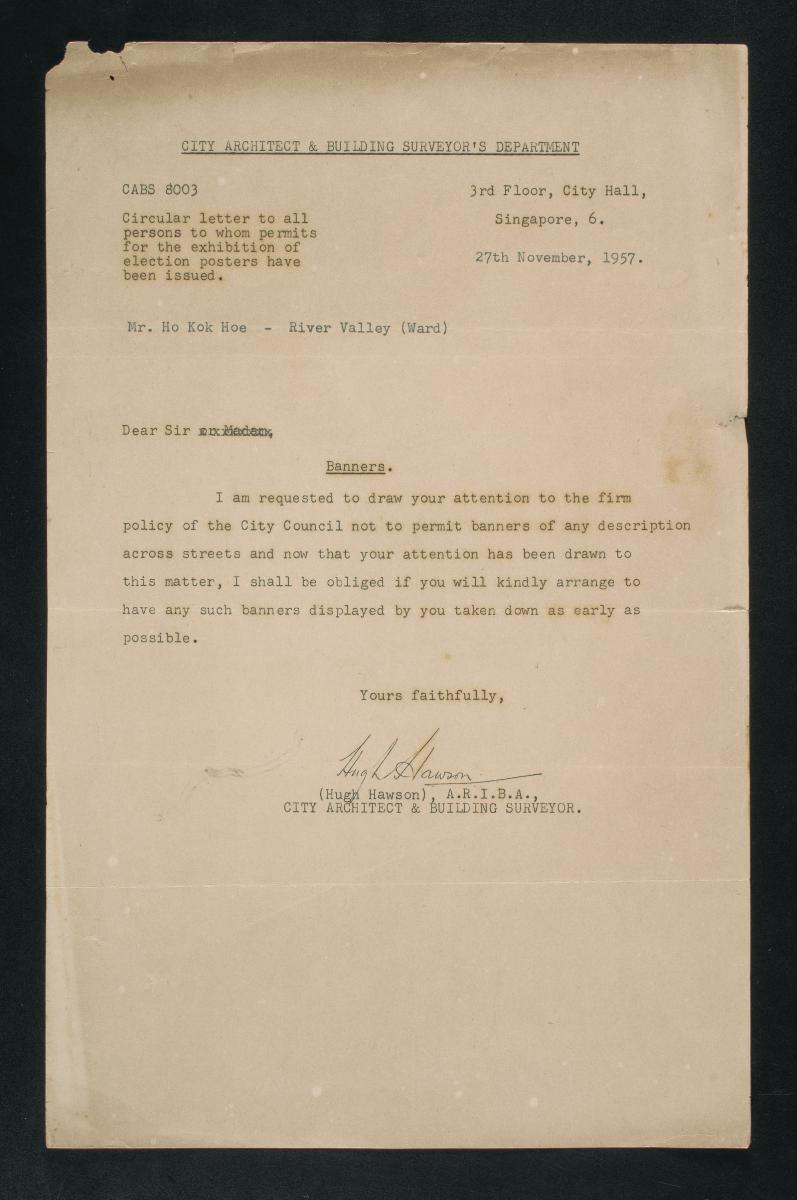 Ho Kok Hoe was the Labour Front (LF) candidate for the River Valley ward in the 1957 City Council Election.The City Council, formerly known as the Municipal Commission, was the local government authority that was tasked with managing public utilities and infrastructure in the city area. Following legislations passed in July 1957, the Council became a wholly elected body of 32 members, one of whom would serve as Mayor. Elections were held in December of the same year. The Labour Front (LF) worked with the People’s Action Party (PAP) to counter the powerful Liberal Socialist Party (LSP) by avoiding contests against each other. The LSP, who had dominated the previous Council, polled only seven seats while the PAP emerged victorious and secured 13 of the 14 seats it contested. However, a PAP-UMNO coalition was subsequently formed and the LF was left without a share of power. Ong Eng Guan of the PAP was eventually appointed Mayor of the Council.