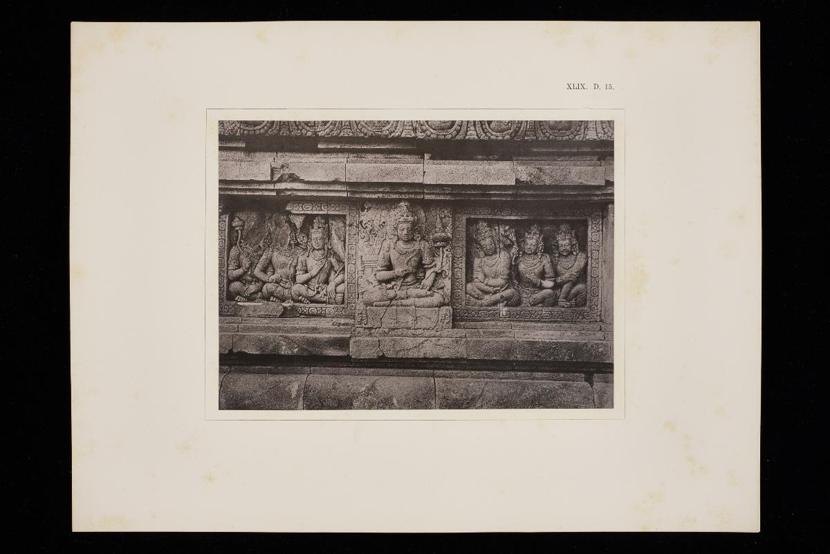 This photograph shows a relief sculpture mounted on the walls of the Hindu- Javanese Candi Prambanan, which houses three main temples dedicated to the worship of the Hindu deities of Shiva, Vishnu and Brahma. The seated figure in the middle resembles a Bodhisattva, which speaks of the influence of Buddhism as an alternative religion that existed and flourished alongside Hinduism in Java at that time. The sculptures share the same characteristics and features as special Hindu divinities. Followers in groups of threes can be seen on either side, but they appear to recede into the background. This photograph is part of a portfolio containing an extensive photographic survey detailing the Candi Prambanan. It was compiled by Dr. Isaac Groneman, a scholar of Javanese history and culture. He was assisted by pioneer Indonesian photographer Kassian Cephas, who was responsible for the pictorial documentation during the excavation of the site from 1889 to 1890.