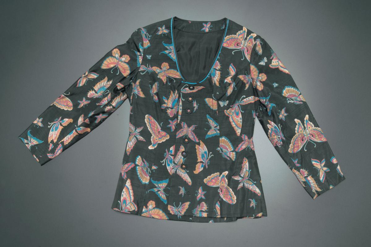 This black sleeveless ankle length cheongsam with a matching jacket belonged to Mdm. Zhuo Yu Chun. Mdm. Zhuo was the director of Tai Wee Company Pte Ltd. The cheongsam is printed on black fabric with butterflies. Both pieces of garments were made of synthetic Thai silk.