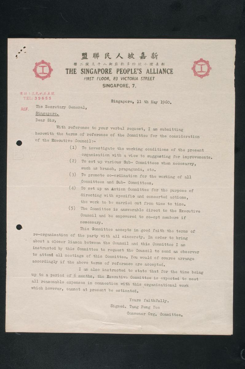 The Singapore People’s Alliance (SPA) was a political party that was formed in 1957. Founded and headed by Singapore’s second Chief Minister, Lim Yew Hock, the Alliance was the result of a merger between the Labour Front (LF) and the Liberal Socialist Party (LSP). The SPA took part in the watershed 1959 Legislative Assembly Election, in which all 51 seats in the legislative body were wholly elected. It fared badly at the polls, losing out to the People’s Action’s Party (PAP) who won by a landslide. The SPA did not win any seats in the 1963 General Election and was dissolved in 1965 after Singapore gained independence.