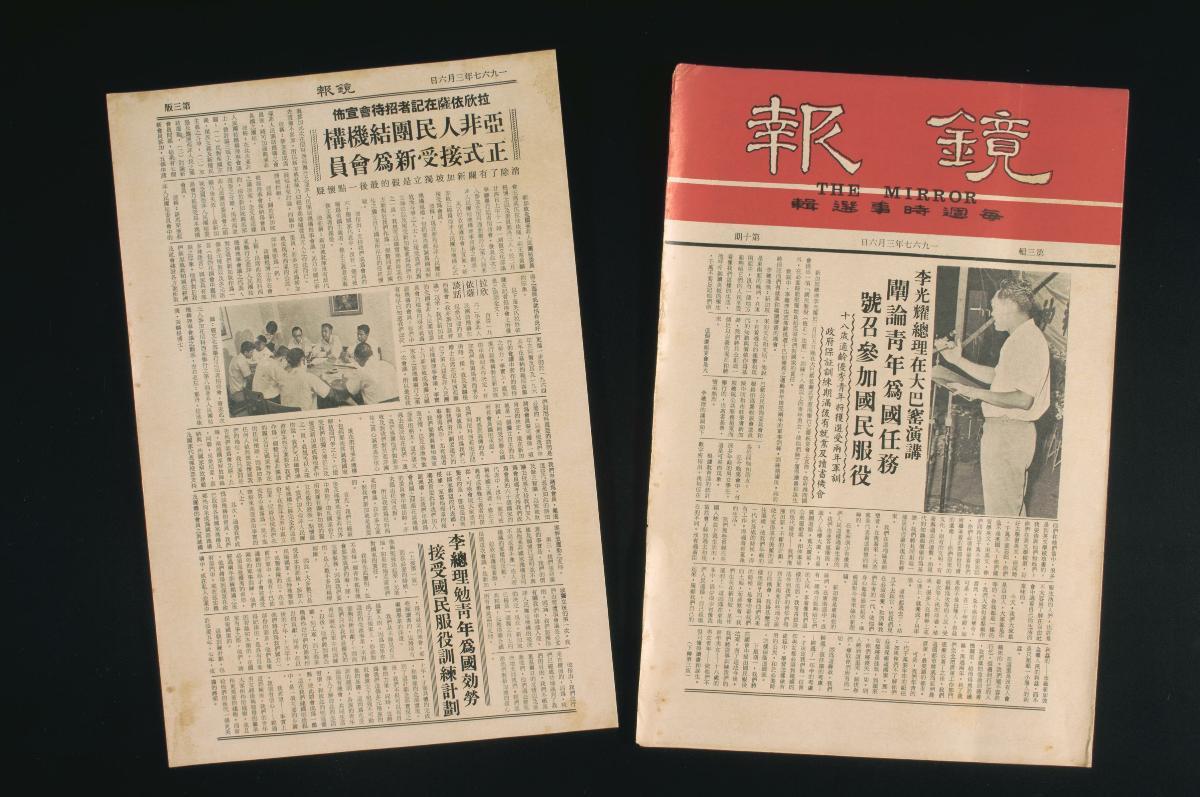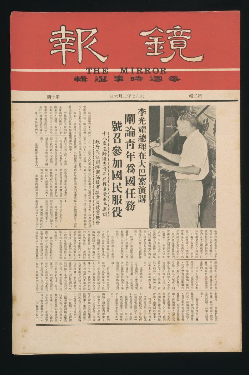 The Mirror, initially called the Malaysian Mirror, was a weekly current affairs magazine that was first published by Singapore’s Ministry of Culture (now Ministry of Information, Communications and the Arts) in March 1965. The brainchild of Singapore’s then Minister for Culture, Mr. S. Rajaratnam, the magazine consisted mainly of reproduced articles from Malaysian and foreign newspapers and was distributed to public organizations and civil bodies for free. The magazine’s distribution to schools in Malaya sparked a war of words between Mr. Rajaratnam and Federal Education Minister Inche Mohamed Khir Johari in July 1965, at the height of tensions between Singapore and the Malayan Federation. Inche Johari had alleged that the Singapore government was using the magazine to spread subversive propaganda. The Malaysian Mirror was renamed The Mirror when Singapore gained independence in August 1965. In the 1970s, it was published fortnightly and contained more original articles on domestic issues written by staff from the Culture Ministry and other statutory boards. The Mirror reinvented itself again in the mid-1980s and was renamed Mirror, which targeted students. It started selling subscriptions in 1988. The last edition of Mirror was published on 15 September 1991.