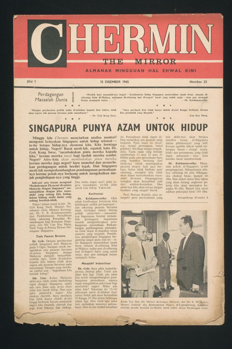 The Mirror, initially called the Malaysian Mirror, was a weekly current affairs magazine that was first published by Singapore’s Ministry of Culture (now Ministry of Information, Communications and the Arts) in March 1965. The brainchild of Singapore’s then Minister for Culture, Mr. S. Rajaratnam, the magazine consisted mainly of reproduced articles from Malaysian and foreign newspapers and was distributed to public organizations and civil bodies for free. The magazine’s distribution to schools in Malaya sparked a war of words between Mr. Rajaratnam and Federal Education Minister Inche Mohamed Khir Johari in July 1965, at the height of tensions between Singapore and the Malayan Federation. Inche Johari had alleged that the Singapore government was using the magazine to spread subversive propaganda. The Malaysian Mirror was renamed The Mirror when Singapore gained independence in August 1965. In the 1970s, it was published fortnightly and contained more original articles on domestic issues written by staff from the Culture Ministry and other statutory boards. The Mirror reinvented itself again in the mid-1980s and was renamed Mirror, which targeted students. It started selling subscriptions in 1988. The last edition of Mirror was published on 15 September 1991.