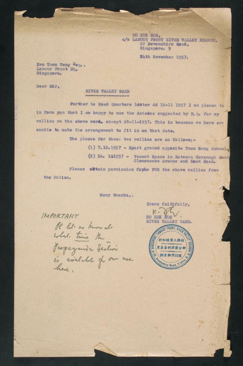 The City Council, formerly known as the Municipal Commission, was the local government authority that was tasked with managing public utilities and infrastructure in the city area. Following legislations passed in July 1957, the Council became a wholly elected body of 32 members, one of whom would serve as Mayor. Elections were held in December of the same year. The Labour Front (LF) worked with the People’s Action Party (PAP) to counter the powerful Liberal Socialist Party (LSP) by avoiding contests against each other. The LSP, who had dominated the previous Council, polled only seven seats while the PAP emerged victorious and secured 13 of the 14 seats it contested. However, a PAP-UMNO coalition was subsequently formed and the LF was left without a share of power. Ong Eng Guan of the PAP was eventually appointed Mayor of the Council.