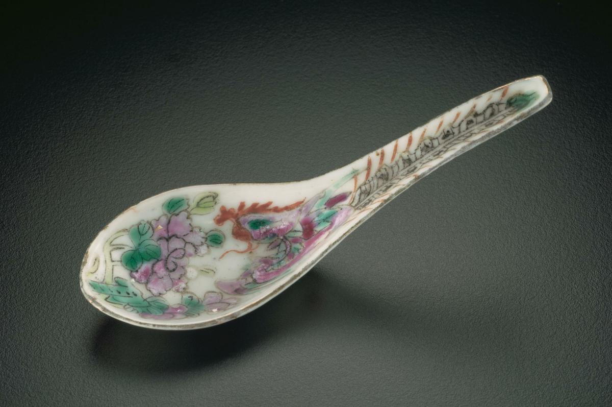 This white-ground dessert spoon belongs to a Nonyaware dinner service. The decoration of colourful enamel pattern with the mythical phoenix trailing up the handle with peony flowers in the well, was a popular design. A Peranakan dinner service, like this set, can total many hundreds of pieces, with about eight different types of vessel shapes and sizes, including dessert ware. Large quantities of this kind of porcelain were made for export to Southeast Asia. Only the wealthiest Peranakan families could afford to place orders for large sets of matching porcelain for celebratory feasts. These impressive displays were laid out on the ‘tok panjang’ (literally ‘long table’) that was the formal dining table for special occasions.