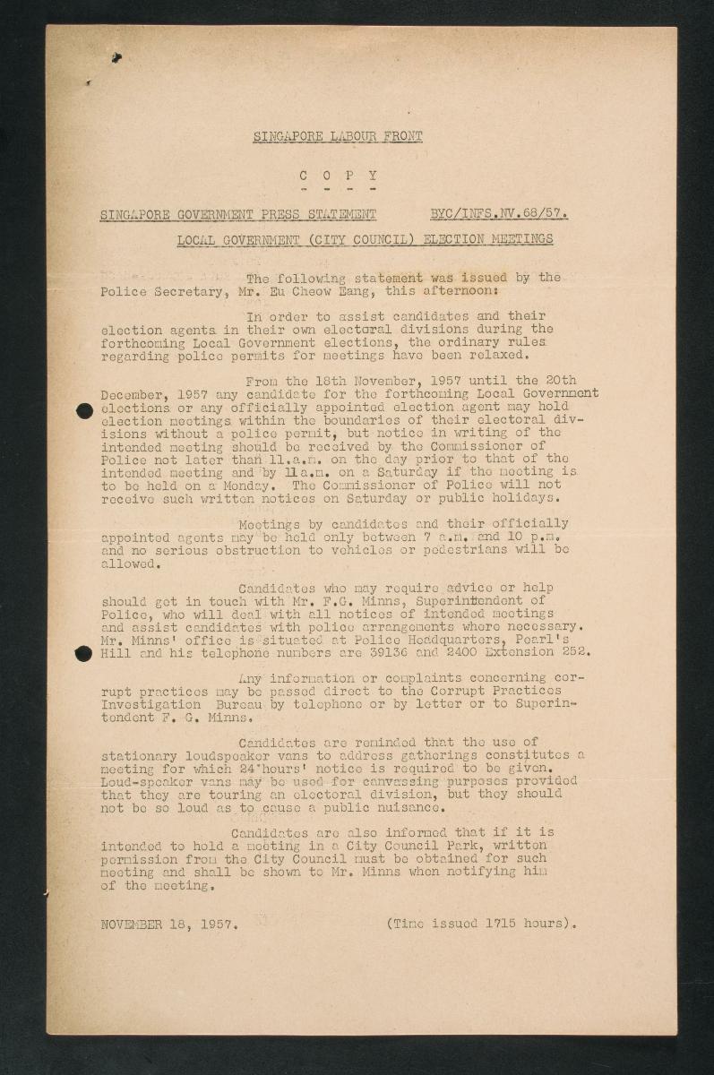 The City Council, formerly known as the Municipal Commission, was the local government authority that was tasked with managing public utilities and infrastructure in the city area. Following legislations passed in July 1957, the Council became a wholly elected body of 32 members, one of whom would serve as Mayor. Elections were held in December of the same year. The Labour Front (LF) worked with the People’s Action Party (PAP) to counter the powerful Liberal Socialist Party (LSP) by avoiding contests against each other. The LSP, who had dominated the previous Council, polled only seven seats while the PAP emerged victorious and secured 13 of the 14 seats it contested. However, a PAP-UMNO coalition was subsequently formed and the LF was left without a share of power. Ong Eng Guan of the PAP was eventually appointed Mayor of the Council.