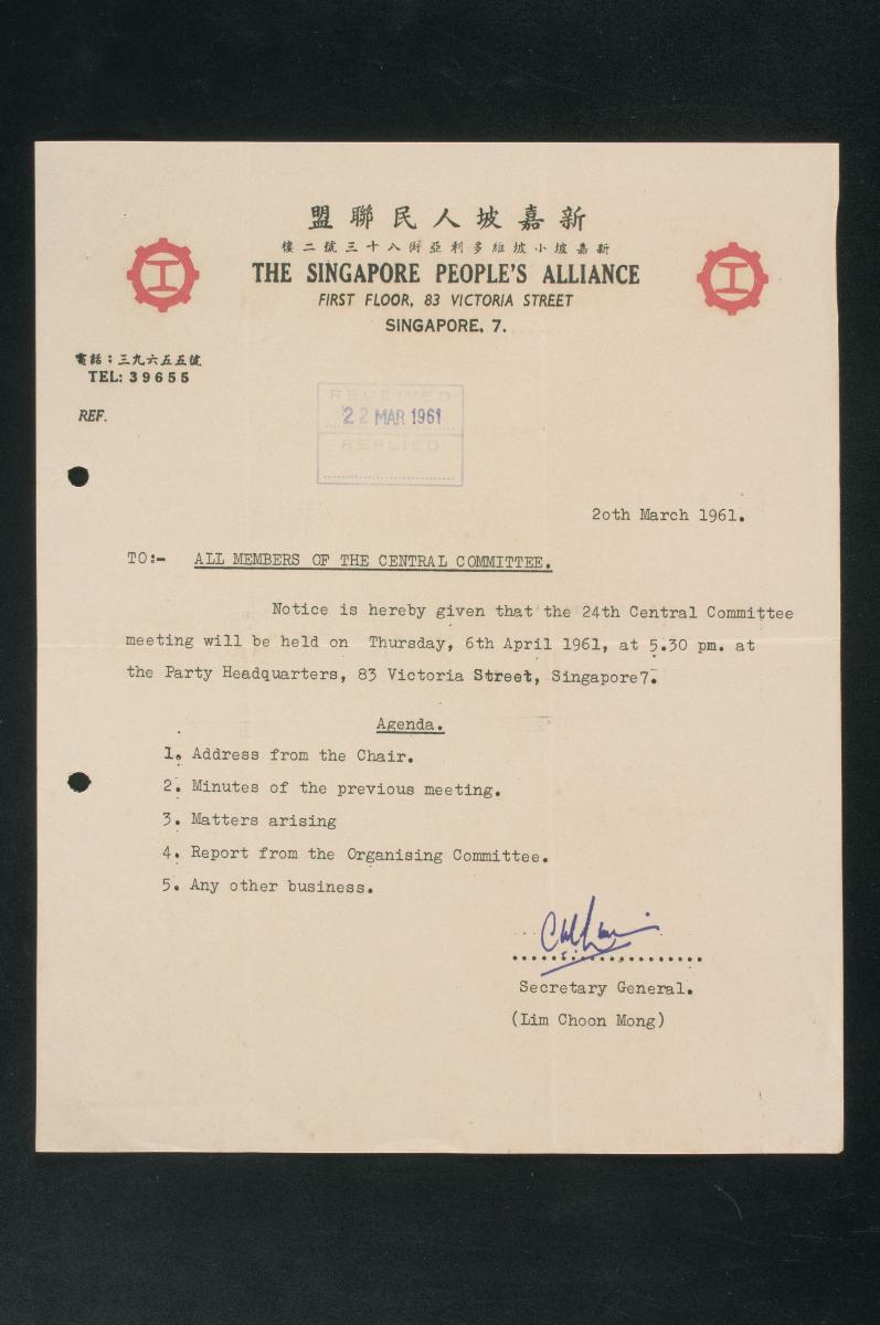 A Singapore People’s Alliance (SPA) circular on the 23rd Central Committee Meeting and the agenda