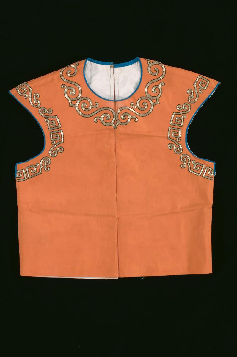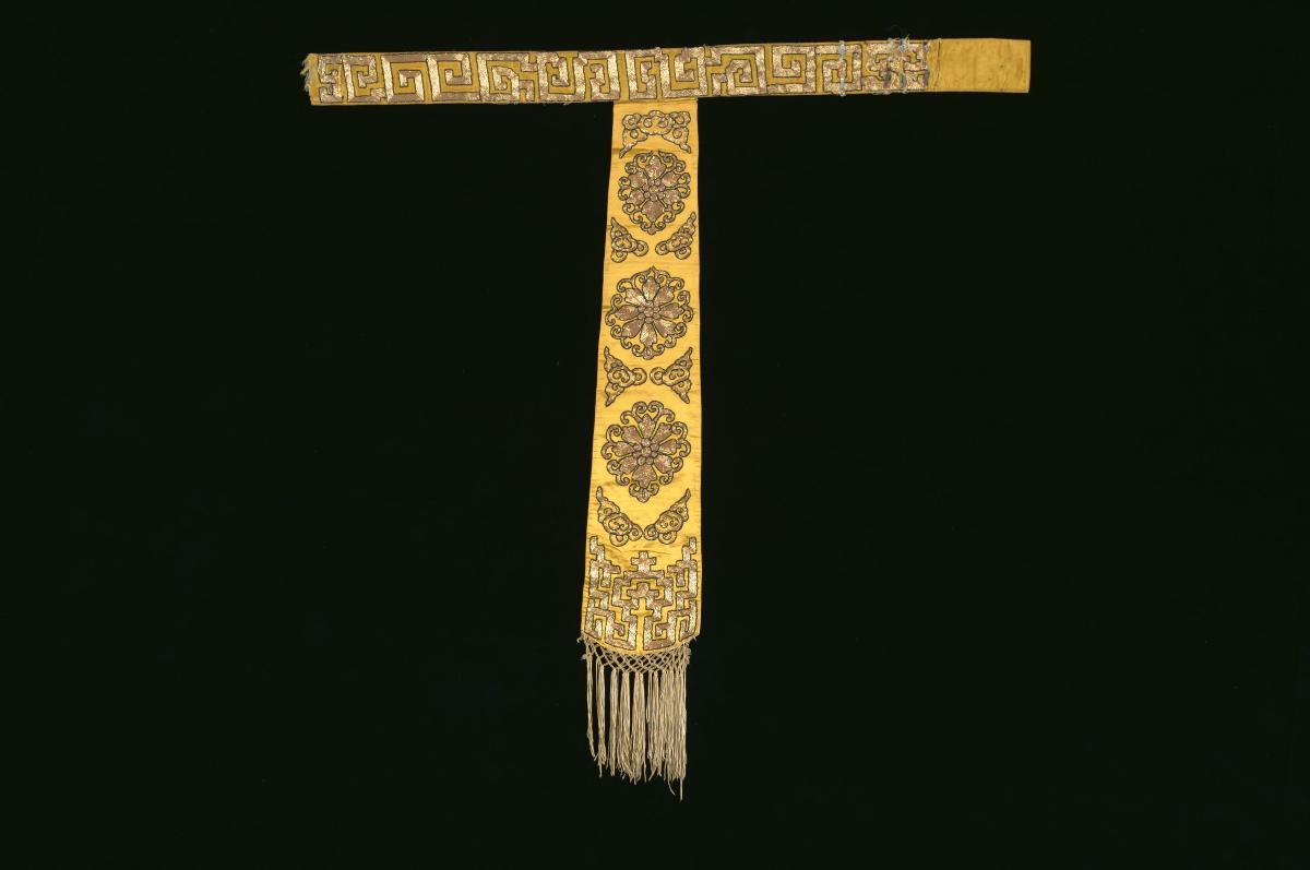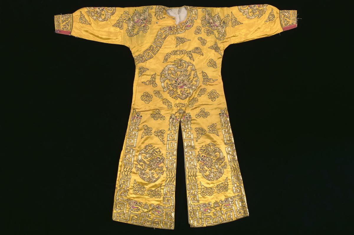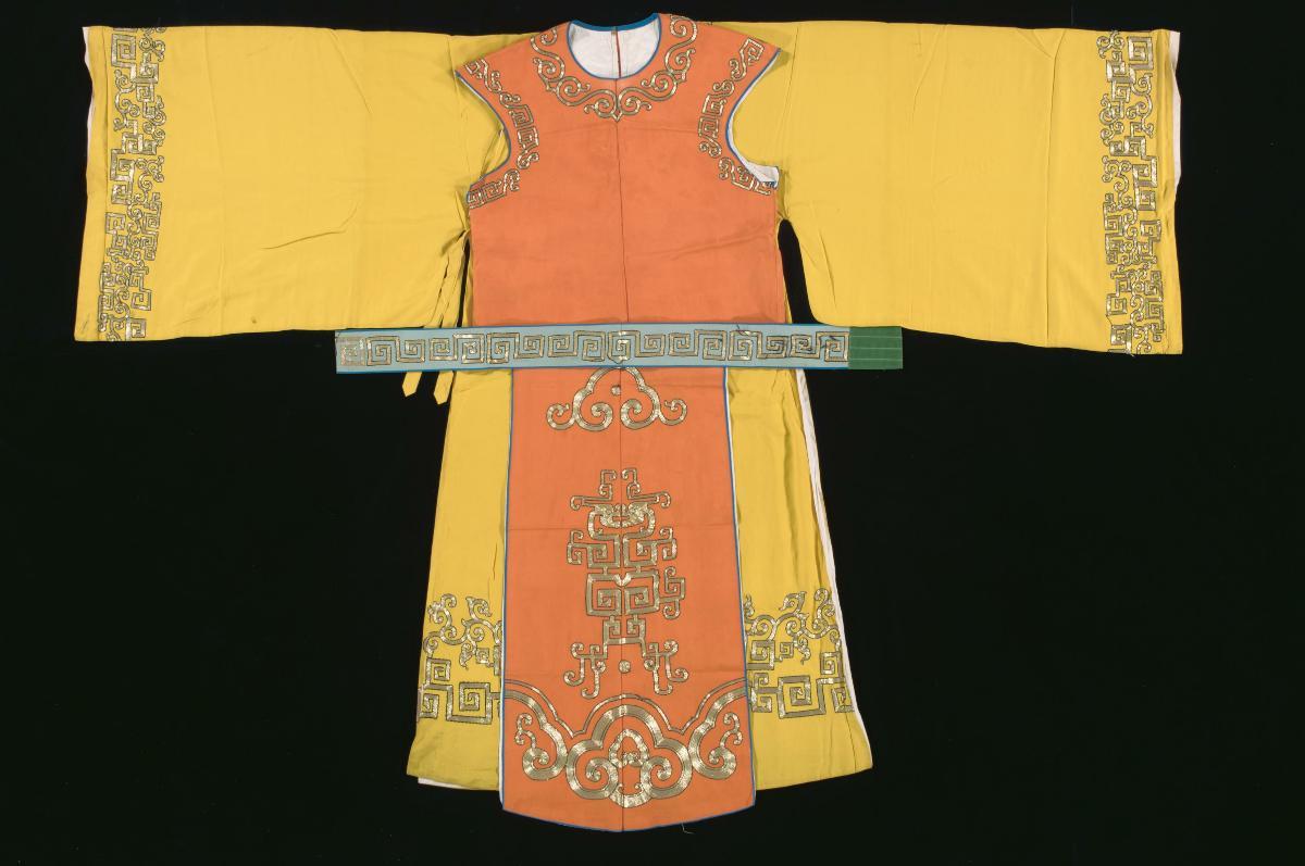 A yellow robe with gold embroidery worn by an emperor in a Chinese opera