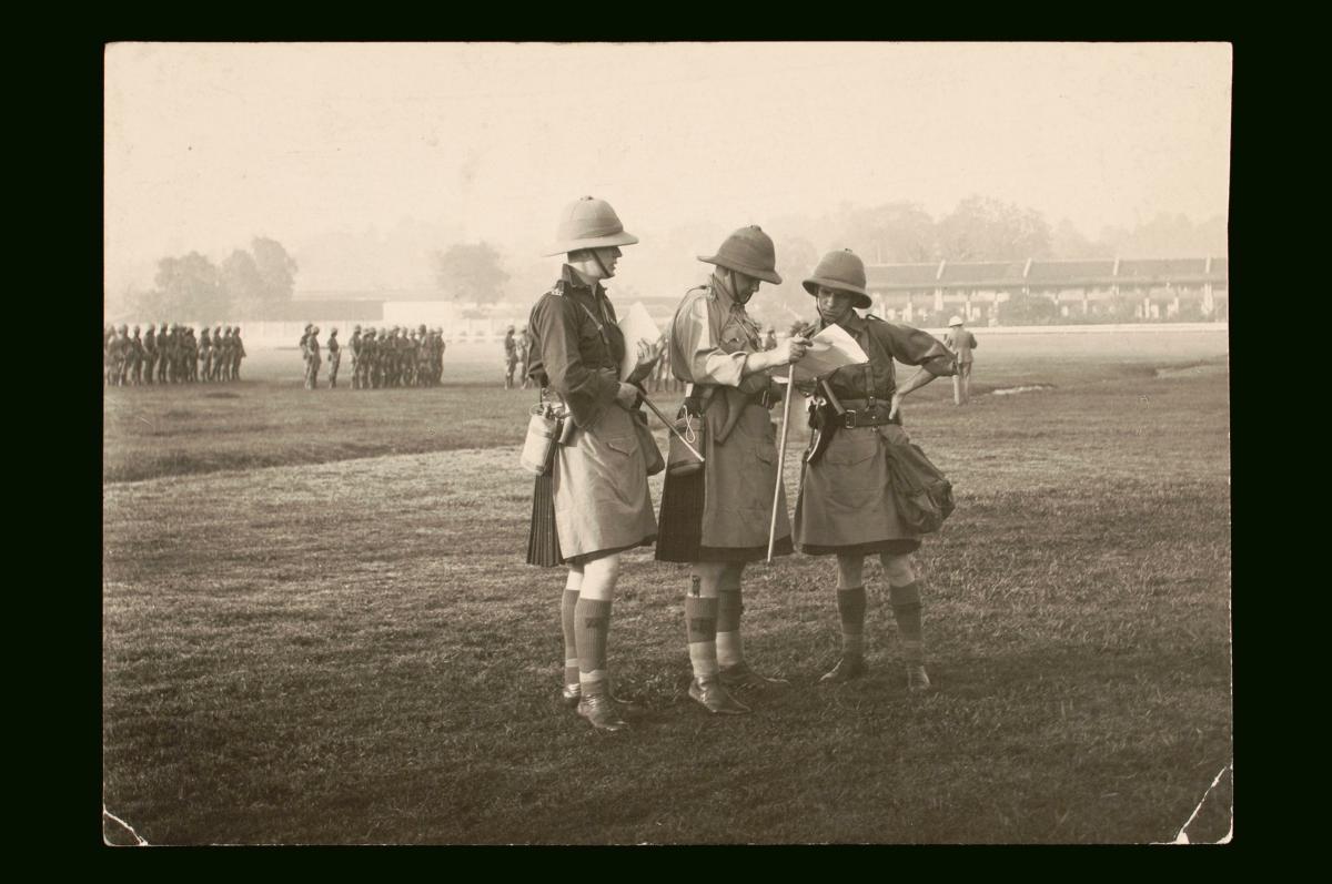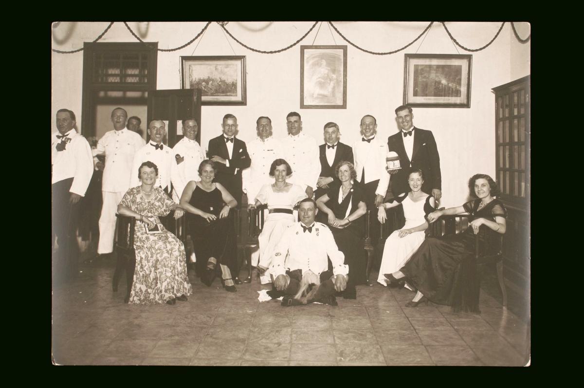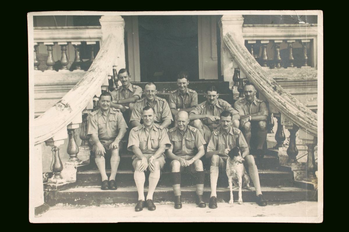 J. B. McMorine (second row, extreme right) sent this photo of himself with his fellow officers to his mother. He was former Chief Sanitary and Food Inspector of Singapore. He and his wife lived in Singapore for over 30 years, and they were interned in Changi Prison when World War II broke out.