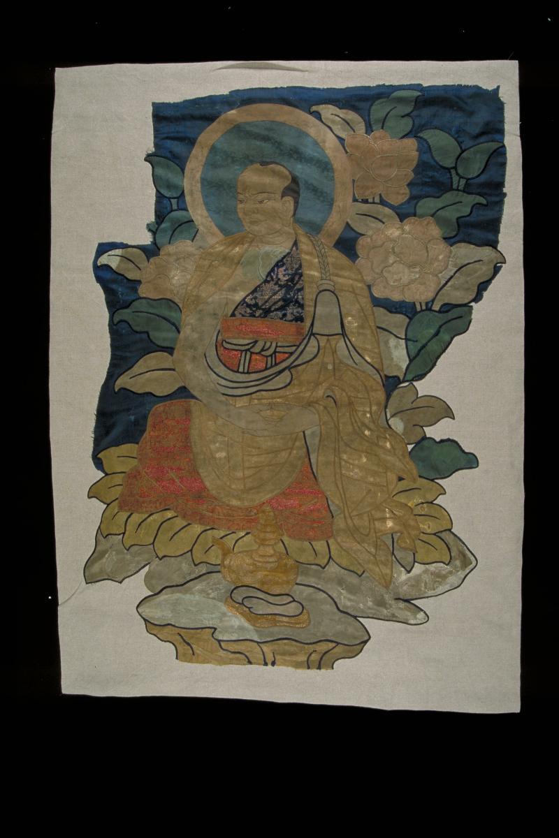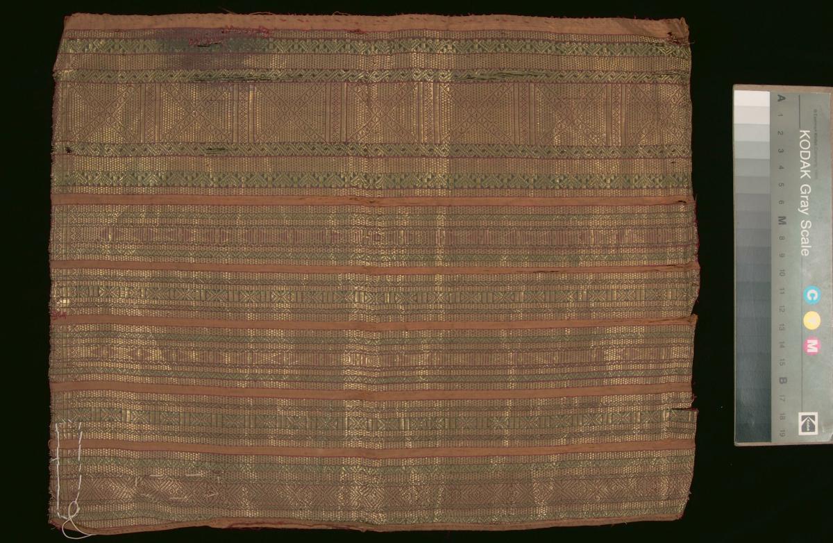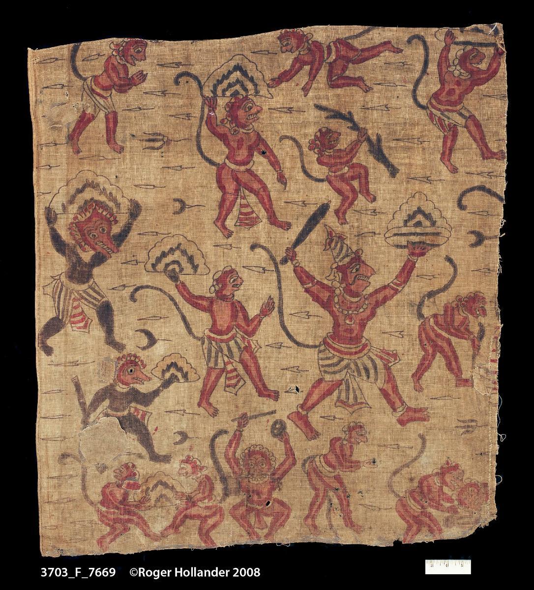 This textile fragment is dyed using the block printing resist dyeing technique on cotton tabby weave cloth. It features the motif of elephants and horses with riders and bottom border of birds and plants.Resist-dyeing technique uses either molten wax or moist mud applied to prevent the dye from colouring areas of the cloth. Carved wooden blocks are used to apply the resist substances. Large quantities of Indian textiles produced in various centres in Gujarat, the Deccan and Coromandel Coast were traded across Southeast Asia until the end of the 19th century. Among their functions, they served as attire for royalty and as diplomatic gifts, as displays on festive occasions, and as clothing for the populace at rites of passage and other ceremonies. These trade cloths had a strong influence on the development of Southeast Asia textiles as it is thought local makers began producing cloth, possibly borrowing patterns and motifs from earlier Indian examples, to make up for the shortage of the Indian ones that began to decline in numbers.