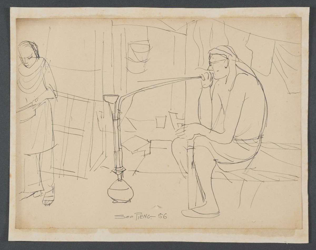 Cheong Soo Pieng is regarded as a pivotal figure in Singapore’s modern art development. Born in Xiamen (Amoy), China in 1914, he was part of a group of artists that attempted to articulate a style identifiable and pertinent to post-war Singapore, then known collectively with Malaysia, as Malaya. This style, later crystallized as the Nanyang Style, provided a foundation upon which future generations of artists learned and expanded on. A key element of the Nanyang Style was the synthesis of Chinese pictorial elements and the diverse formalistic qualities from the School of Paris.An important part of Cheong’s artistic development was his travels. He had visited Sarawak in 1959 and was so captivated by the Borneo community that he made another trip to Sabah in 1961. Besides collecting artefacts, he also made a number of sketches and drawings to record his experiences interacting with the community. ‘(Untitled) Dayak with Tattoos Smoking’ is an example of Cheong’s study of the community’s daily activities.