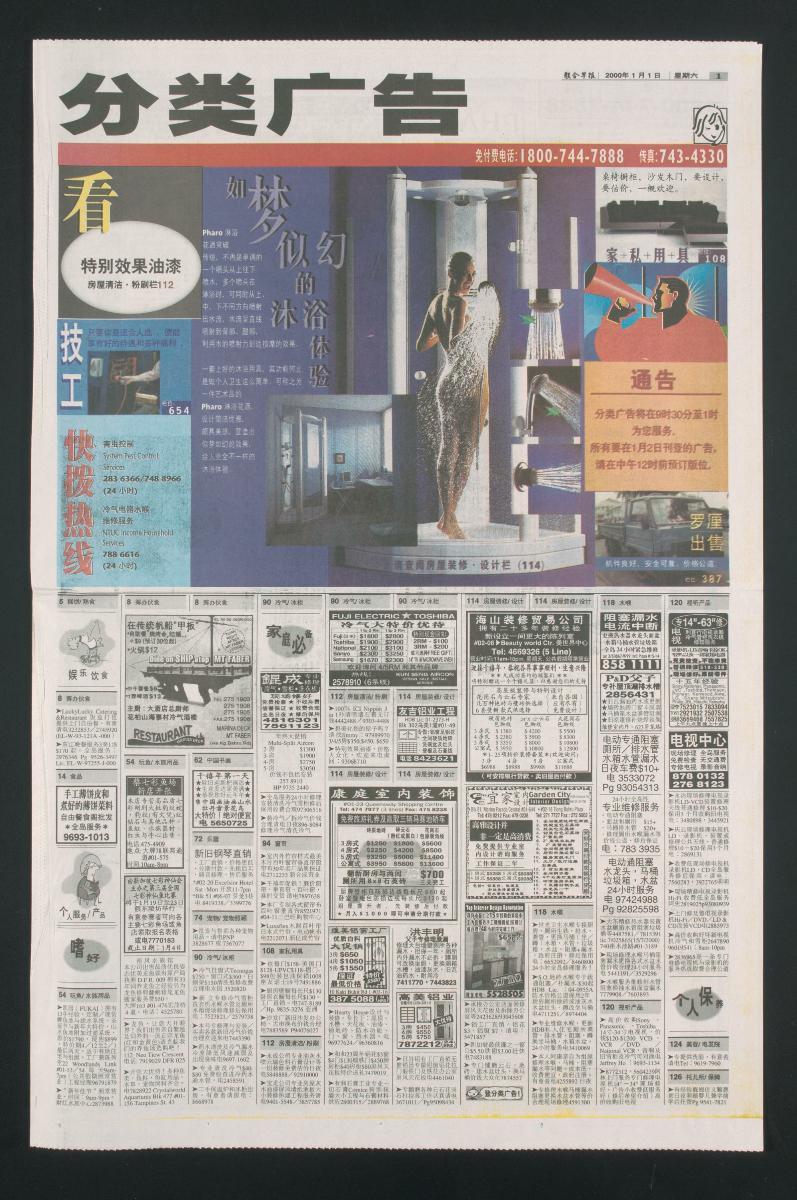 Lianhe Zaobao is a daily Chinese language broadsheet newspaper owned by Singapore Press Holdings. It is the highest circulated Chinese daily in Singapore, with a daily readership of about 800,000. It was established in 1983 with the merger of two of Singapore’s oldest Chinese newspapers, Nanyang Siang Pau and Sin Chew Jit Poh. This particular edition of Lianhe Zaobao is significant as it is the first edition of the 21st century.