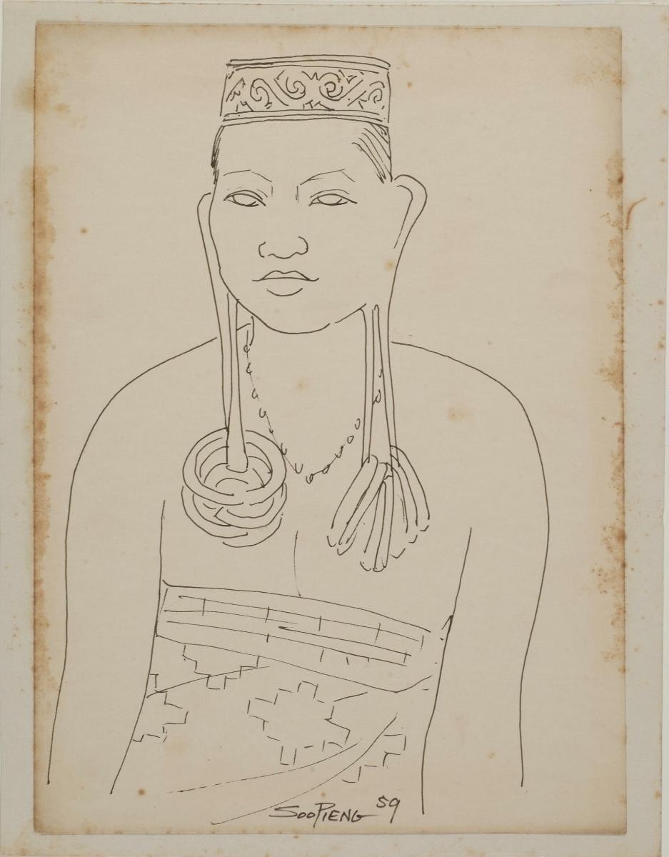 Cheong Soo Pieng is regarded as a pivotal figure in Singapore’s modern art development. Born in Xiamen (Amoy), China in 1914, he was part of a group of artists that attempted to articulate a style identifiable and pertinent to post-war Singapore, then known collectively with Malaysia, as Malaya. This style, later crystallized as the Nanyang Style, provided a foundation upon which future generations of artists learned and expanded on. A key element of the Nanyang Style was the synthesis of Chinese pictorial elements and the diverse formalistic qualities from the School of Paris. An important part of Cheong’s artistic development was his travels. He had visited Sarawak in 1959 and was so captivated by the Borneo community that he made another trip to Sabah in 1961. Besides collecting artefacts, he also made a number of sketches and drawings to record his experiences interacting with the community. ‘(Untitled) Seated Dayak Woman’ is an example of his long-standing interest in the human figure.