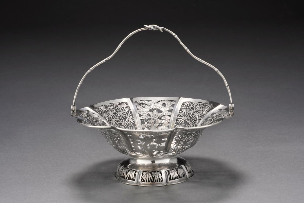 This finely decorated silver basket shows various silverwork techniques. The rim of the basket features openwork panels of flowers, fruits, fishes and shrimps followed by engraved geometric patterns on the background. The inner repoussé panels depict flowers with various Chinese auspicious animals and symbols such as a pair of calabash, tortoises, fishes, butterflies, a lizard, a mythical Qilin, and an eel. The exterior repoussé flowers extended its petals to form the feet of the basket.The production of Chinese export silver extends from the 18th to mid 20th century. Early Chinese export silver were mere copies from European models and decorated with European motifs. Subsequently, due to increasing awareness and popular demand from foreign patrons, local craftsmen began to introduce traditional Chinese decoration. High quality workmanship at a low labour cost added greatly to the demand and appeal for such a market.