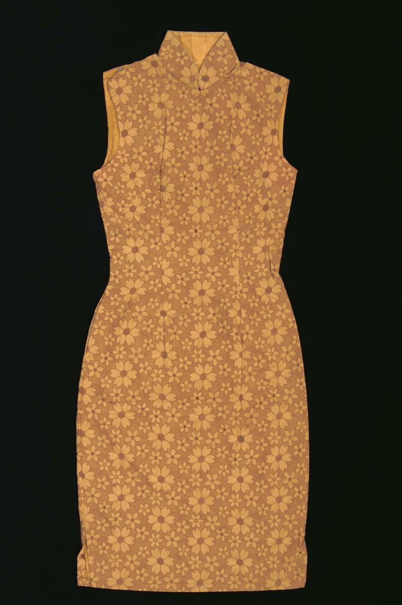 This is a green and orange ankle-length cheongsam decorated with floral motifs arranged in geometric squares, a reflection of the preference for bright colours and bold prints during the 1970s. This piece is made from jersey, a knitted fabric made from cotton or a blend of cotton and synthetic fibres. It is known for its stretchability and tends to cling to the body, helping to create the fitted silhouette archetypal of a cheongsam.When the cheongsam first emerged as a fashion style in the 1920s and 1930s, it was worn long with the hem ending at the ankles. As shorter hemlines became popular in the 1950s and 1960s, long cheongsams were worn mostly as evening wear or on more formal occasions.