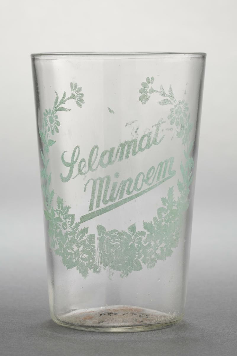 This glass is part of a set of glasses found in a Peranakan family’s heirloom collection. Floral motifs and geometric shapes form a decorative border at the top of the glass.