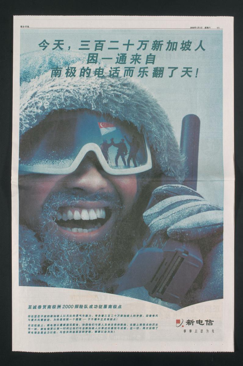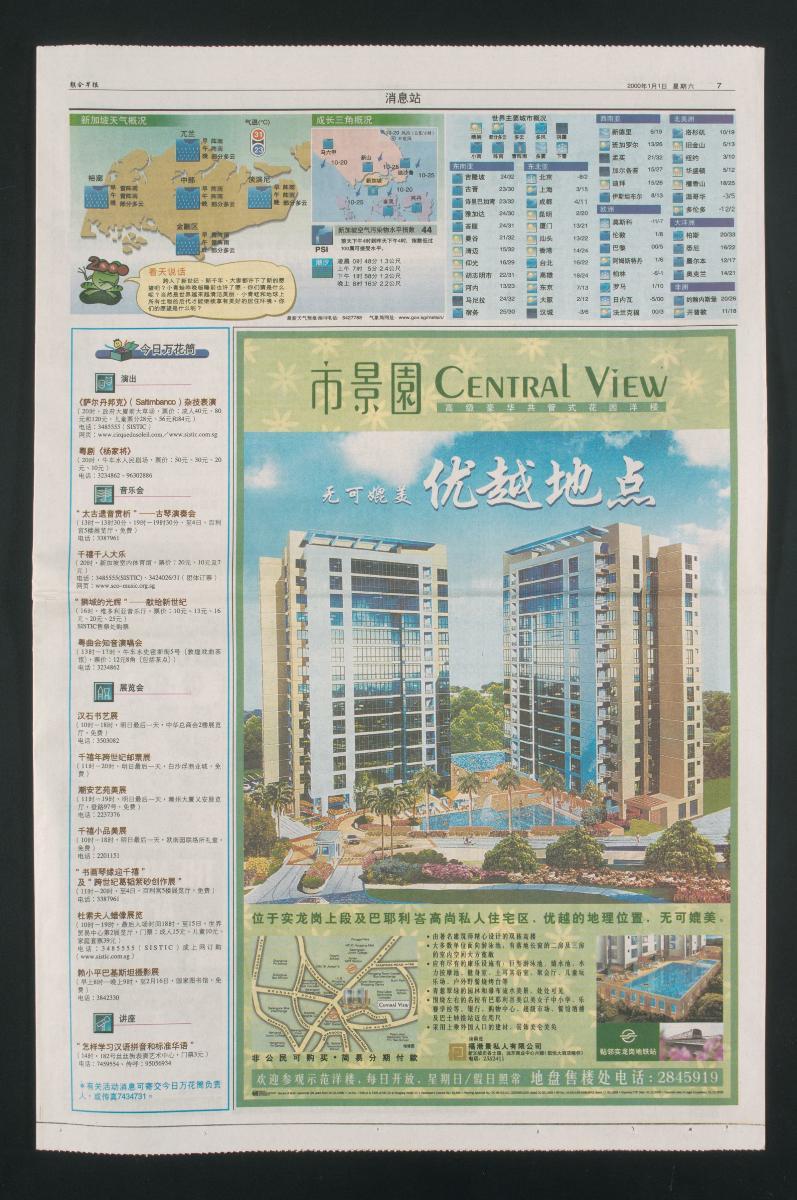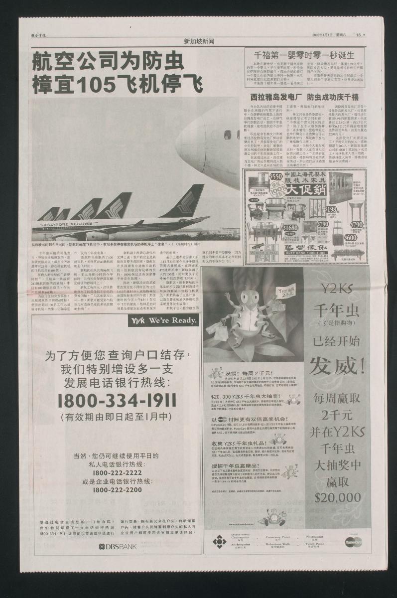 Lianhe Zaobao is a daily Chinese language broadsheet newspaper owned by Singapore Press Holdings. It is the highest circulated Chinese daily in Singapore, with a daily readership of about 800,000. It was established in 1983 with the merger of two of Singapore’s oldest Chinese newspapers, Nanyang Siang Pau and Sin Chew Jit Poh. This particular edition of Lianhe Zaobao is significant as it is the first edition of the 21st century.