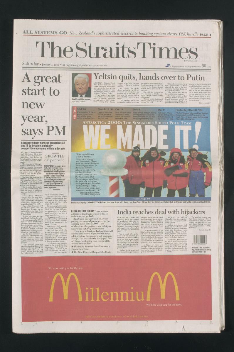 The Straits Times is an English language broadsheet daily newspaper. It is the most widely-circulated and oldest surviving newspaper in Singapore. The paper was established on 15 July 1845 by Armenian businessman Catchick Moses and was originally known as The Straits Times and Singapore Journal of Commerce. The Straits Times is currently owned by Singapore Press Holdings. This particular edition of the Straits Times is significant as it is the last Straits Times edition of the 20th century.