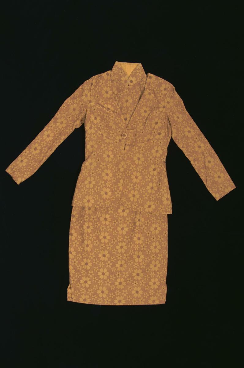 This floral sleeveless knee length cheongsam with a matching jacket belonged to Mdm Zhuo Yu Chun, director of Tai Wee Company Pte Ltd. The cheongsam is printed with red roses and yellow flowers. Both pieces of garments were made from synthetic silk.