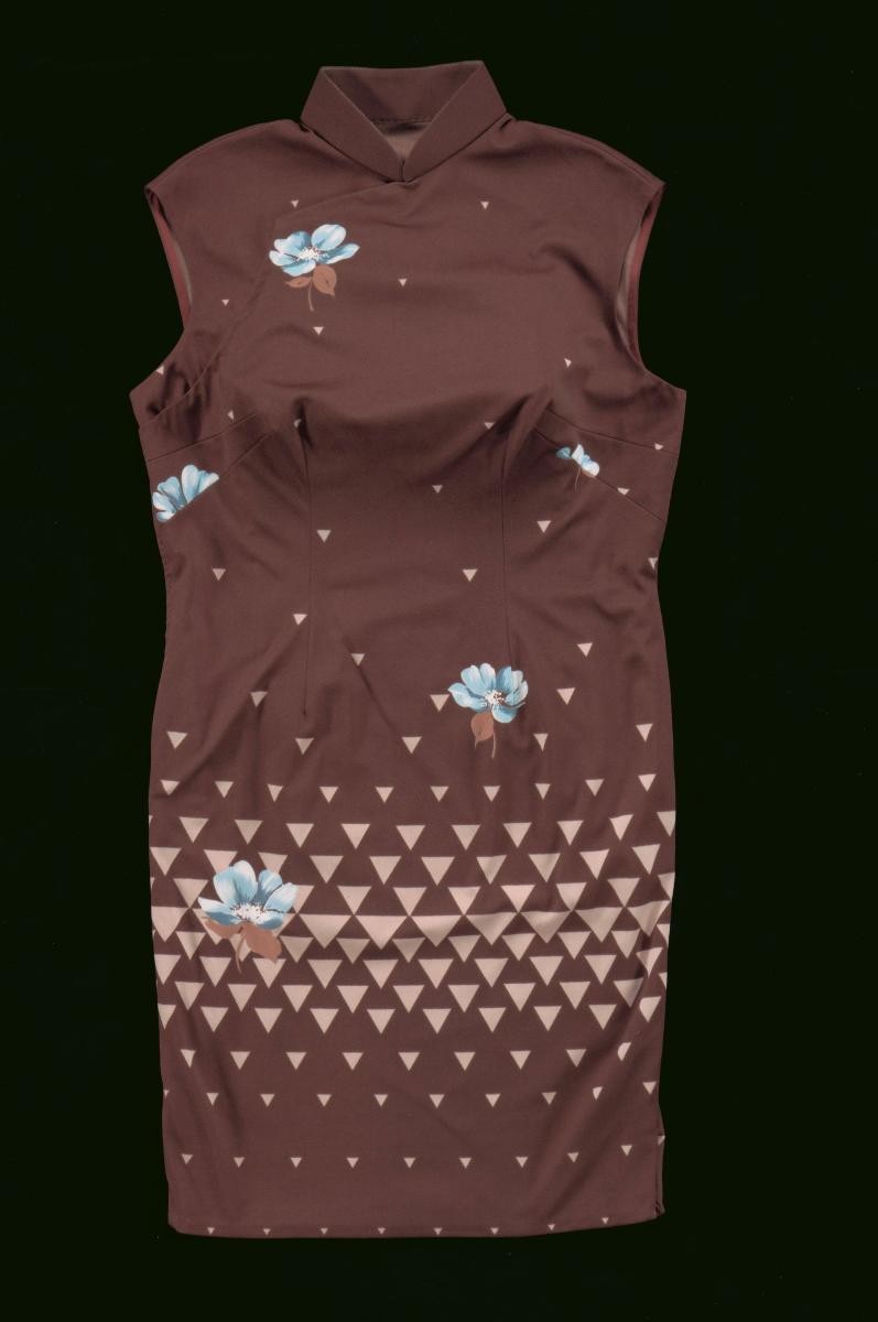 The brownish red printed jacket with green piping around the collar was made for a brown sleeveless cheongsam. The jacket is decorated with light brown buttons down the centre. It was worn by Mdm Zhuo Yu Chun, director of Tai Wee Company Pte Ltd. Both pieces of garments were made from synthetic Thai silk.